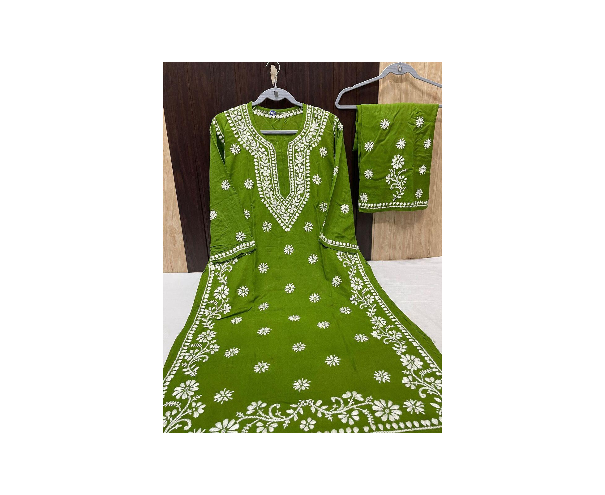 Our Chikankari kurta palazzo set is a masterpiece of traditional craftsmanship, featuring intricate embroidery on soft rayon fabric. This elegant set is perfect for everyday wear, formal occasions, or festive celebrations.