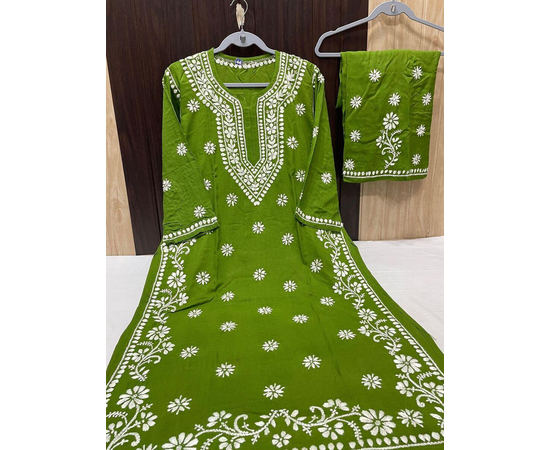 This beautifully crafted kurta palazzo set showcases the traditional art of Chikankari embroidery, which is intricately woven into the fabric of the garment. The soft Rayon fabric ensures comfort and ease, making it perfect for all-day wear.