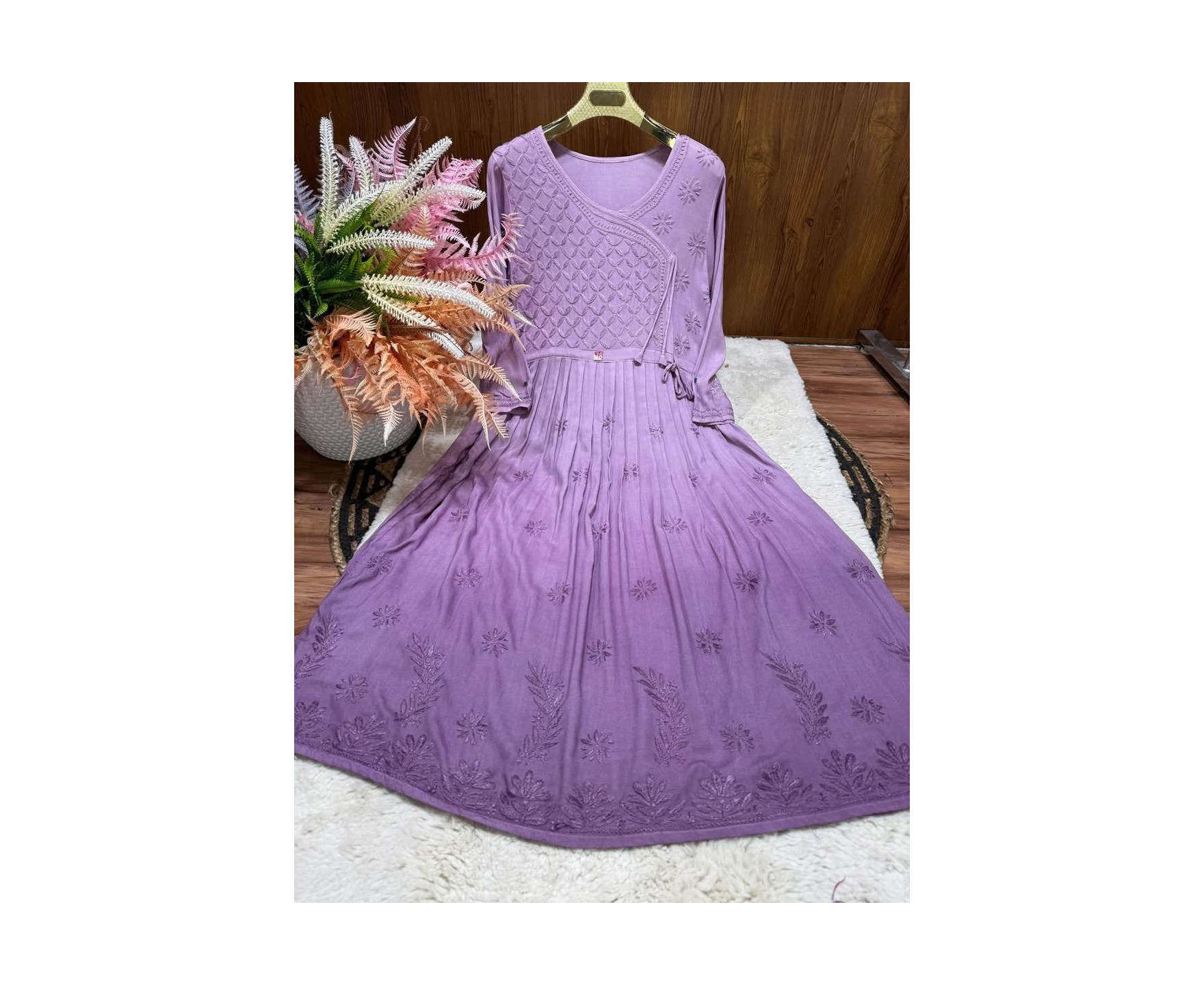 Handmade Lucknowi Chikankari Angrakha Gown | Elegant Hand-Embroidered Rayon Kurti for Women | Summer Wear