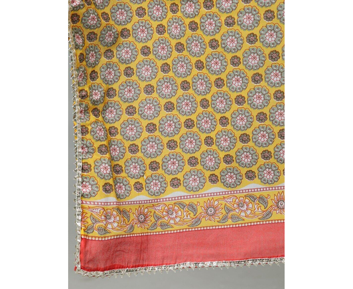 Product Detail : Blue Yoke Embroidered A-Line Kurta Sharara Set, has a round neck, Three-Quarter Sleeves, Straight hem, has side slit