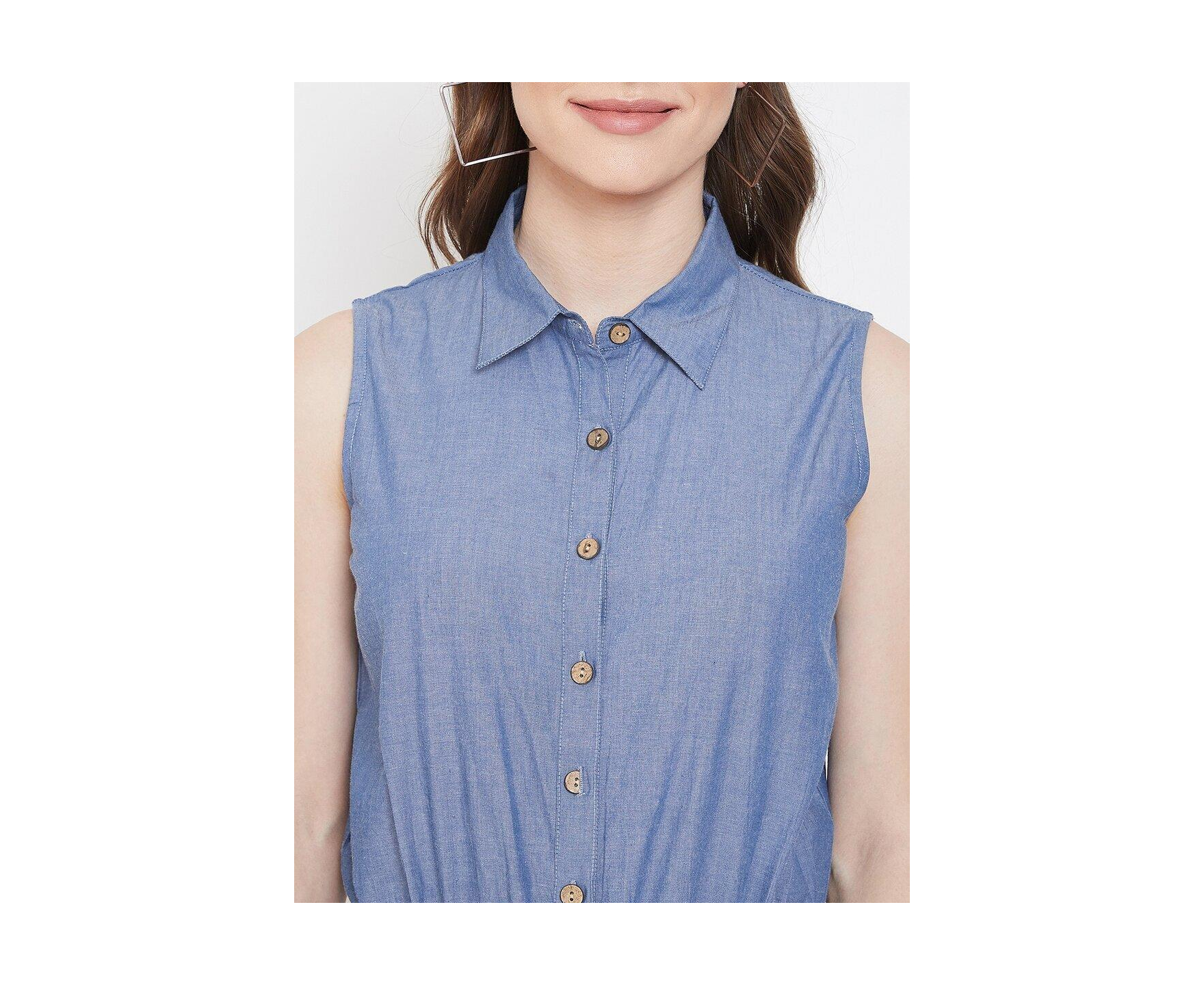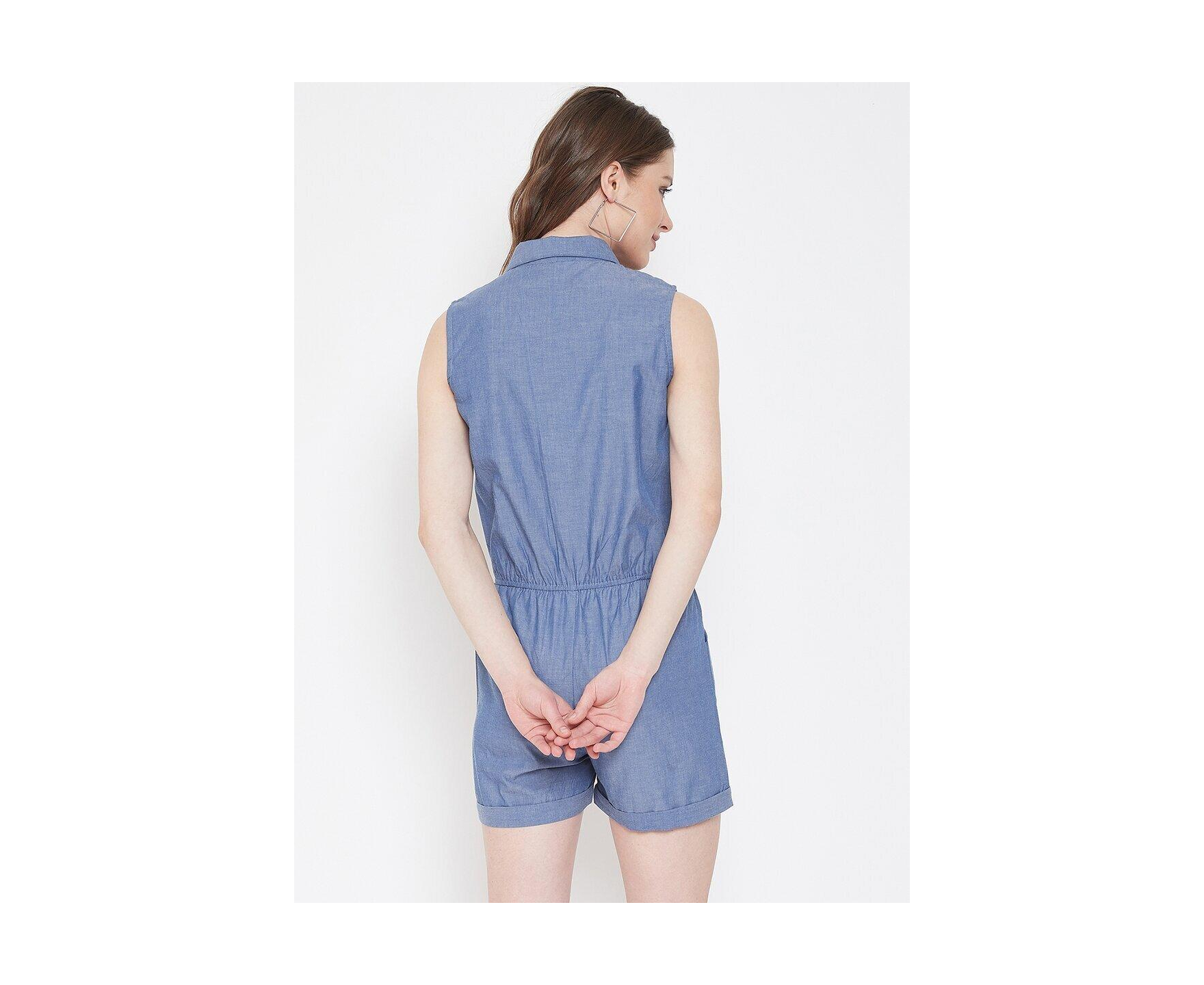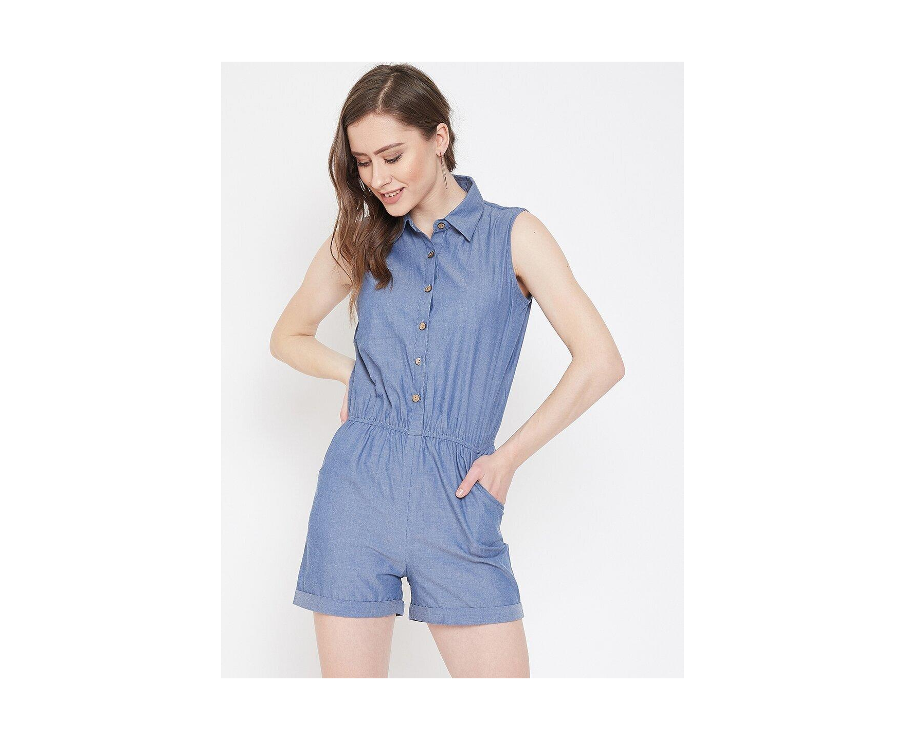 Women Denim Short Jumpsuit, Sleeveless Turn-down Collar Sexy Jeans Playsuit for Women, Women's Denim Cotton Solid Blue Playsuit/Romper
