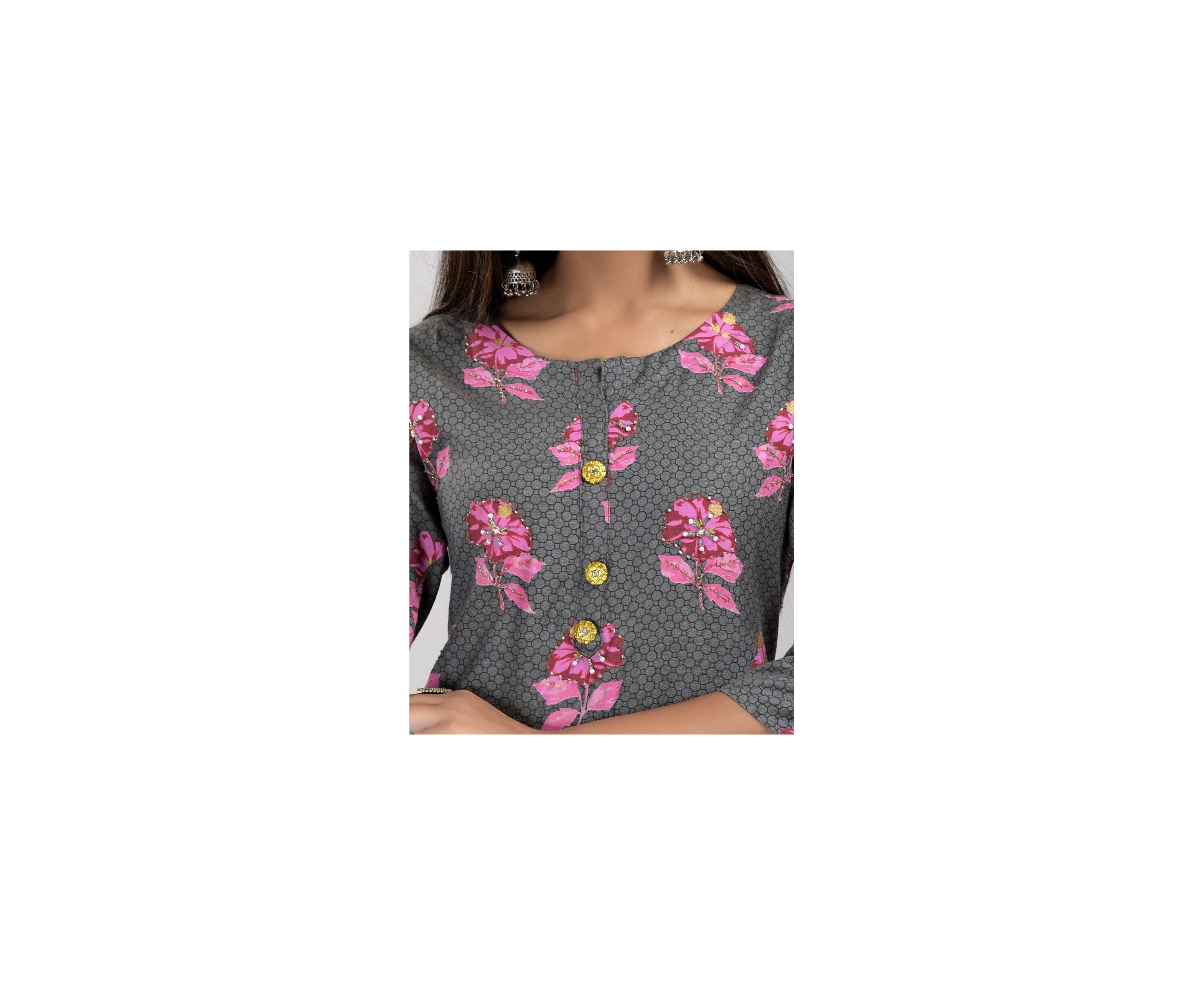 This Rayon kurta has side cut kurta with pink printed flowers and sequence work, it looks too pretty with stunning look while wearing, this designer Kurti and pant set will make you the star of this upcoming season.