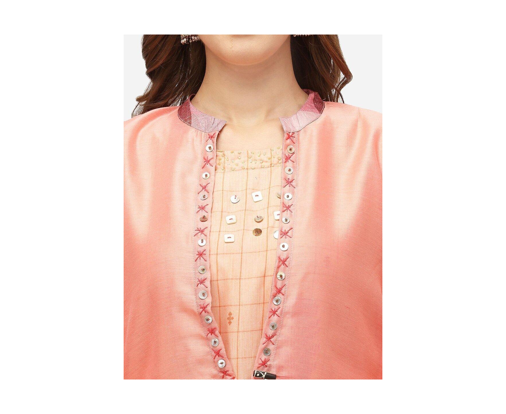 This Peach Cotton-blend Kurti is the perfect choice for a weekend outing. It is designed in an A-line dress style, with a jacket. The design is a favorite for picnics, outdoor, traveling, cycling, dancing, and stage performance. Use it as casual or formal wear for office, shopping, daily wear in a home, college, family, meetings, festive occasions