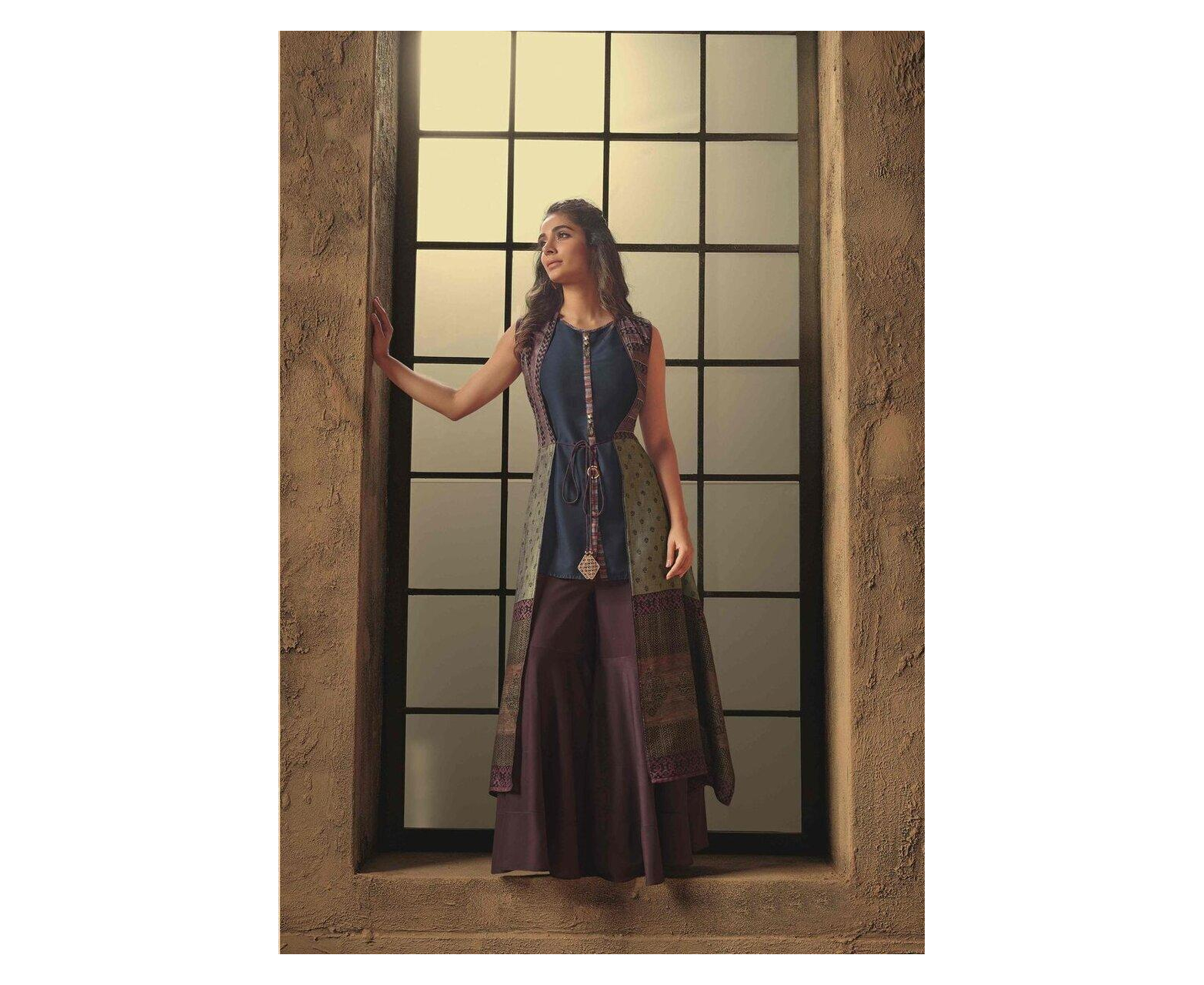 Navyaa short kurta, Palazzo and Jacket, Kurti top with Sharara Pants & Multicolor long Shrug, Women's Ethnic wear kurti set, party wear dress, Exclusive Designer outfit for women and girls