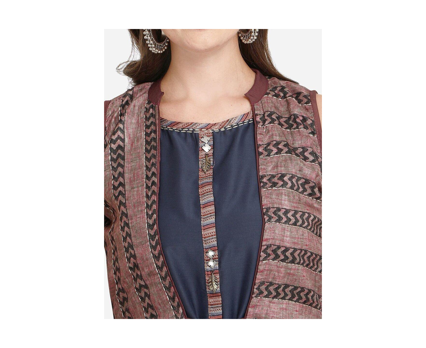 Go for a Bohemian look in this top and palazzo set with a floor-length georgette jacket. The sleeveless top has a dappled black and brown print all over. Its notched, Round neckline has rust and off-white thread detailing, embellished with silver beads, a single wooden rectangle bead, and an ornate silver latkan. Side pockets are fitted on the fade-printed palazzos. The jacket is designed with black and rust panels on the front, and wine and rust panels on the back. All edges and hemlines of the jacket are highlighted with ikat and abstract geometric printed bands. The top front panels are adorned with grey thread and silver bead detailing, along with latkan Dori ties at the waist.