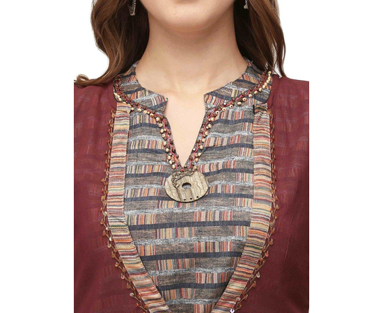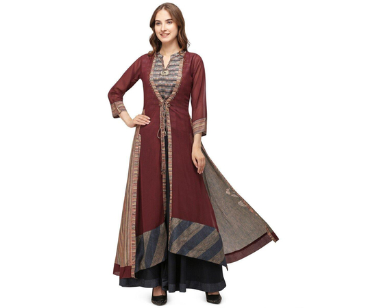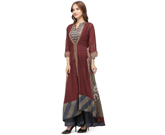 Vibrant hued printed cotton sleeveless top crafted with an embroidered notch neckline and enhanced with embroidered moti and jewels. Paired with flared palazzo bottoms in solid Prussian blue. The set is matched with a long maroon georgette jacket, embroidered and studded with jewels, along with latkan Dori tie-up and stitched printed border.