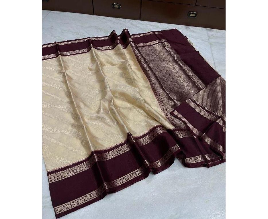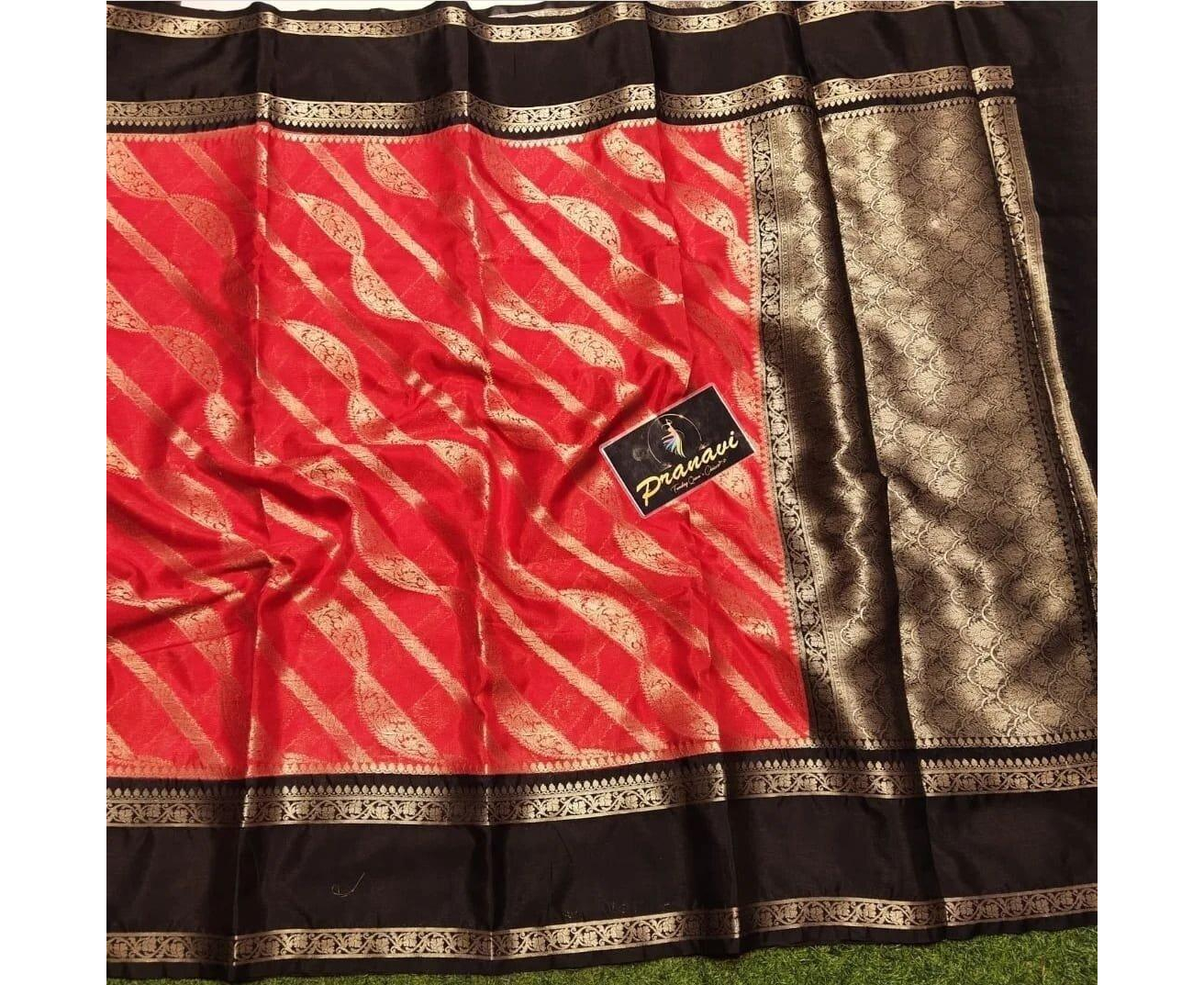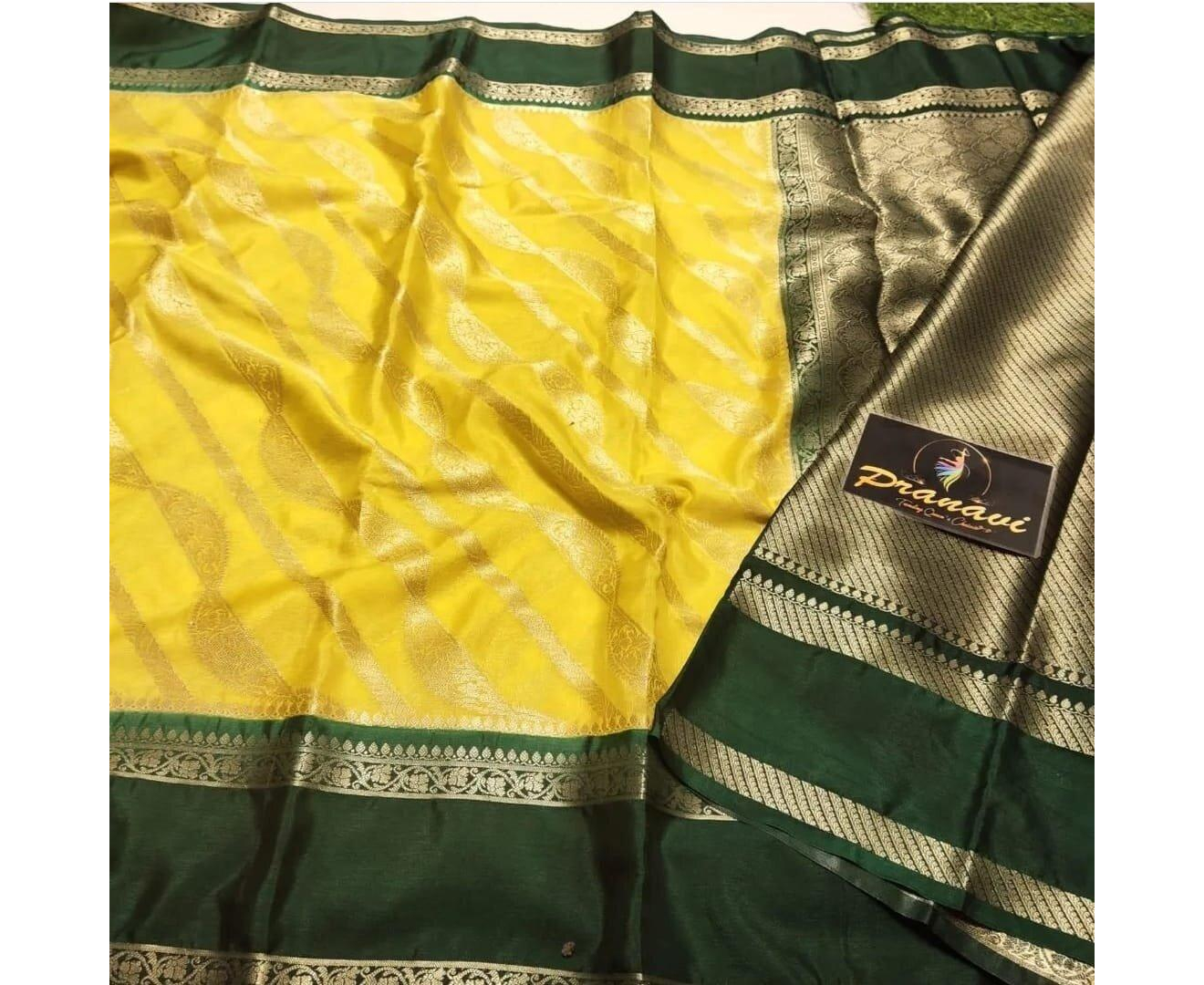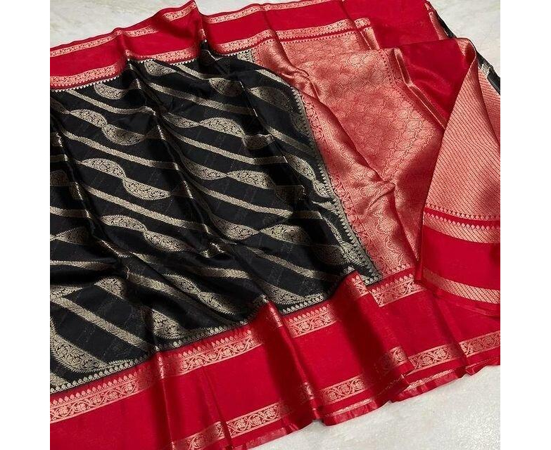 Traditional Designs: These sarees often feature traditional Indian designs such as floral patterns, paisleys, peacocks, leaves, and vines. The designs are inspired by Mughal and Persian art, and they give the saree a timeless and classic appeal.