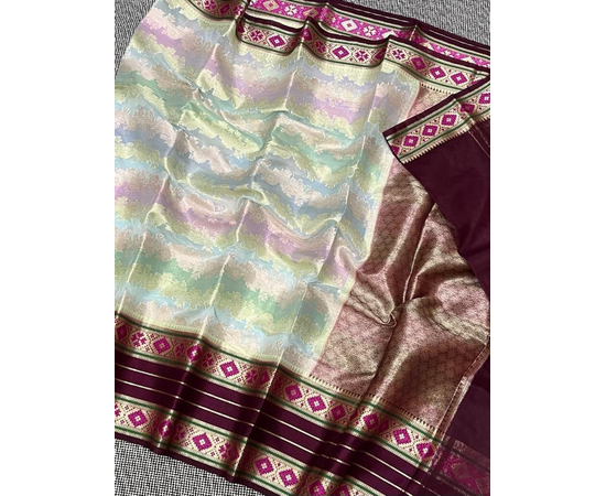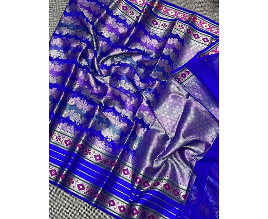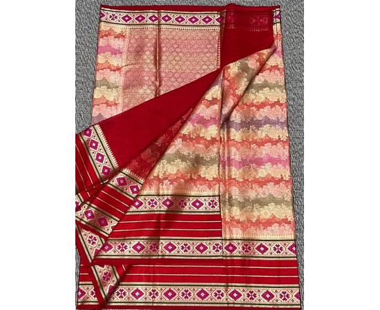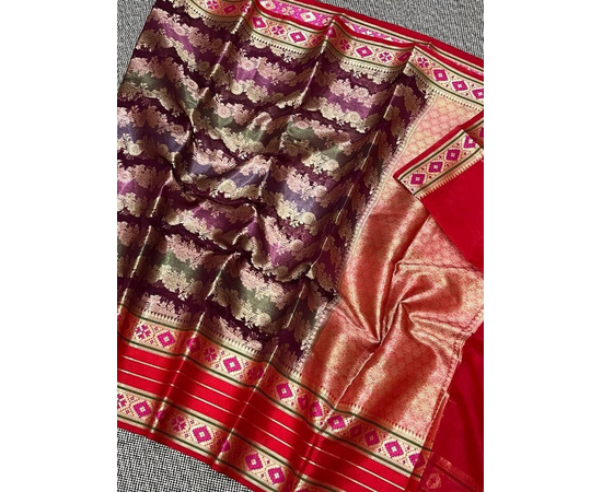 Alfi Meena Kari Embellishment: Meenakari or Meena Kari is a traditional form of enamelwork that involves the fusion of colorful glass with metal surfaces, often gold or silver. This technique is used to add intricate and vibrant designs to jewelry, accessories, and sometimes clothing. If a saree has "Alfi Meena Kari Embellishment," it would mean that it's decorated with enamelwork in a specific style or pattern called "Alfi."