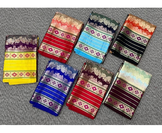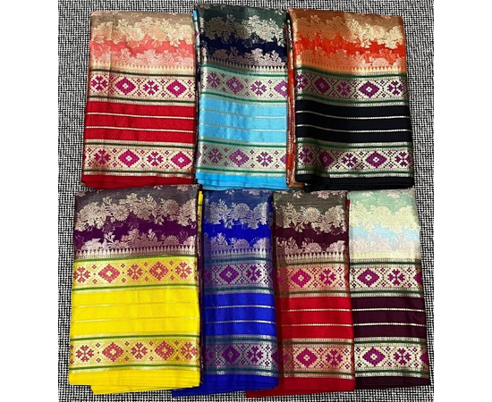 Alfi Meena Kari Embellishment: Meenakari or Meena Kari is a traditional form of enamelwork that involves the fusion of colorful glass with metal surfaces, often gold or silver. This technique is used to add intricate and vibrant designs to jewelry, accessories, and sometimes clothing. If a saree has "Alfi Meena Kari Embellishment," it would mean that it's decorated with enamelwork in a specific style or pattern called "Alfi."