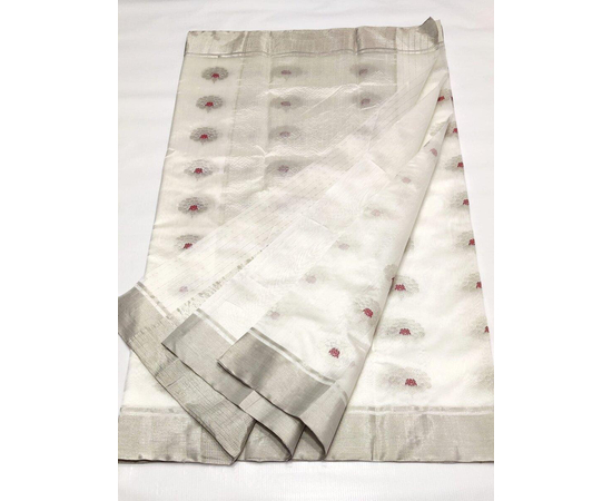 Fine Fabric Handloom Banarasi Katan Silk Saree in White & Silver Border with Traditional Banarasi Handwoven Silver Floral Pattern Weave Design On Sari