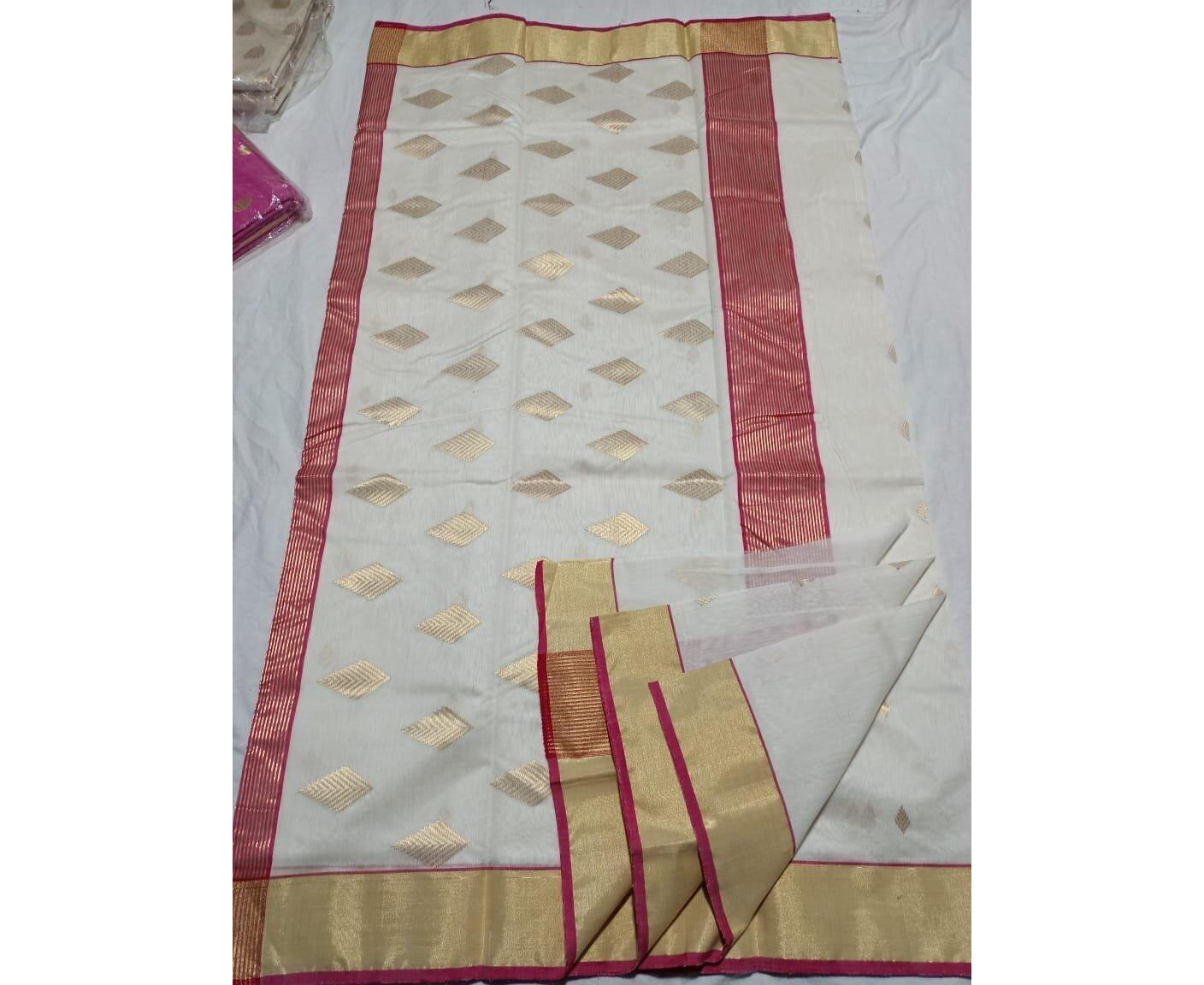 A High Quality Beautiful White Color Pure Katan Silk Banarasi Saree with Red & Golden border Golden Zari work all over. The entire saree has delicate Golden zari Meenakari work. It has a gold Zari border and heavy brocade Pallu. A classic traditional Banarasi saree for all wedding celebrations. Vendor has personally handpicked the saree from the manufacturer in Banaras Varanasi, India. The saree comes with unstitch attached blouse.