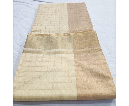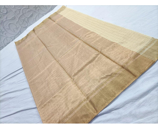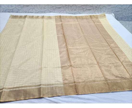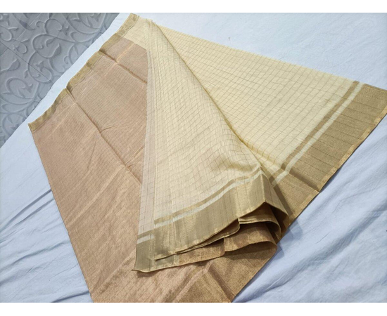 Fine Fabric Handloom Banarasi cotton silk sari, beautiful Cream And Brown color golden Check Pattern Knitting Saree, Saree for special occasion