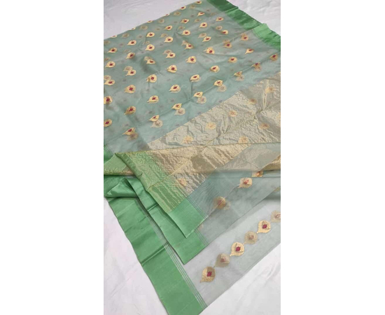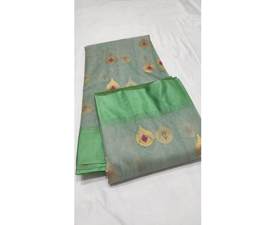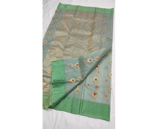 Handmade Woven katan silk Saree - Meenakari border and booti with Zari work - Green Silk Saree with Blouse