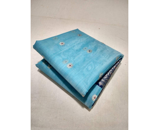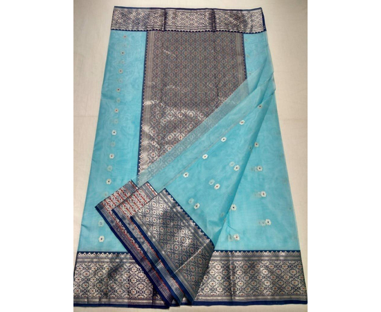 Pure Katan silk saree in aqua Blue color. It has Paithani broad border and Paithani pallu in Gold zari. The beautiful pink blouse adds to the elegance of the saree. The fabric has a soft feel. It's a classic traditional Banarasi saree apt for all celebrations. Saree with attached unstitched blouse