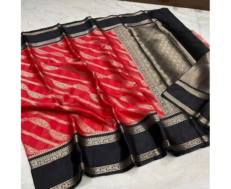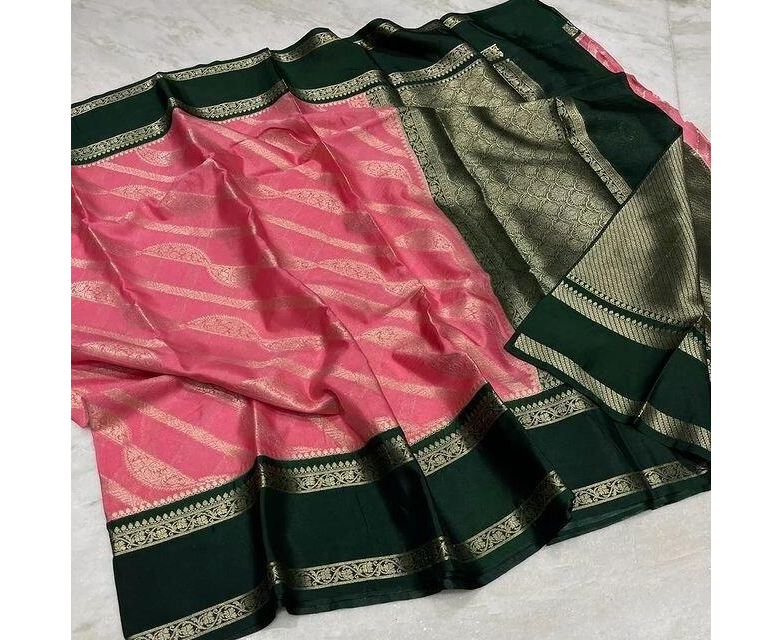 Traditional Designs: These sarees often feature traditional Indian designs such as floral patterns, paisleys, peacocks, leaves, and vines. The designs are inspired by Mughal and Persian art, and they give the saree a timeless and classic appeal.