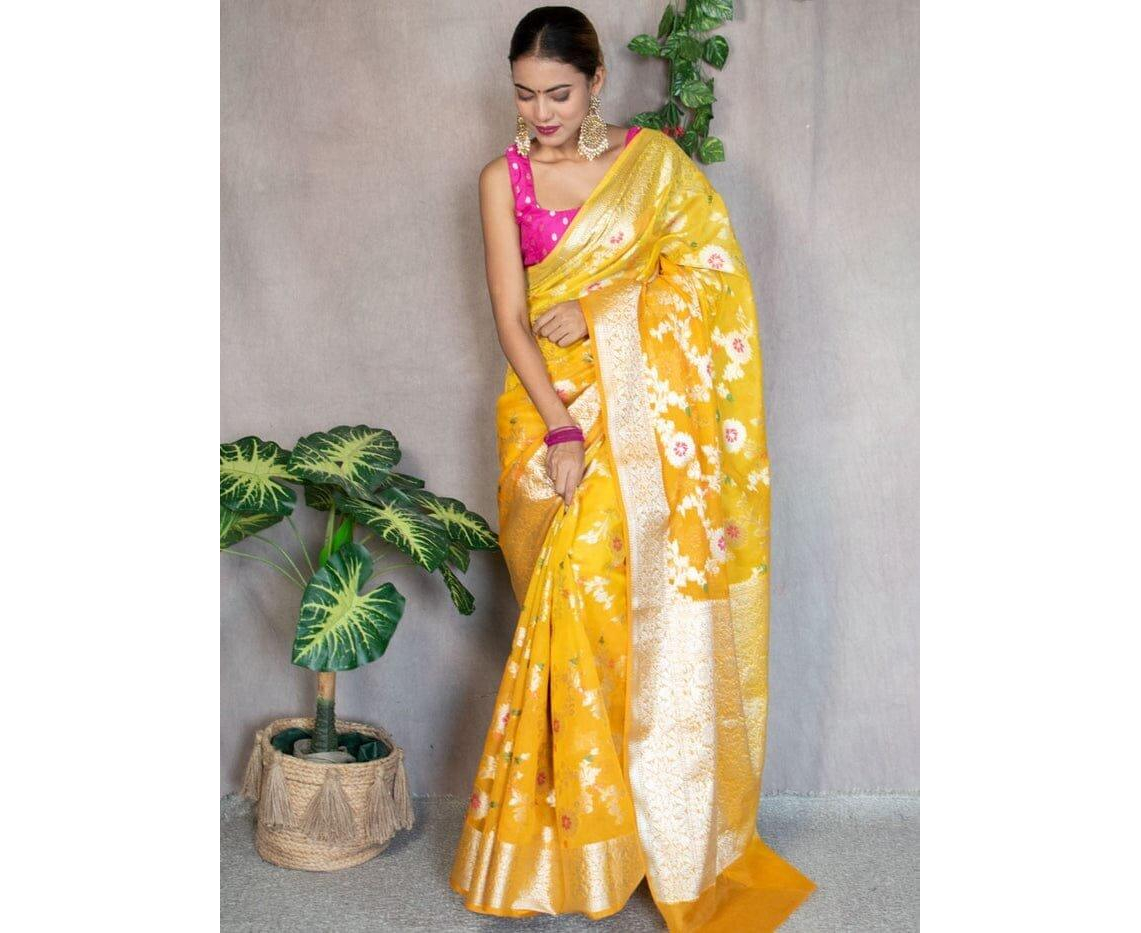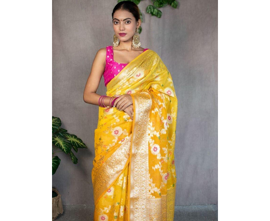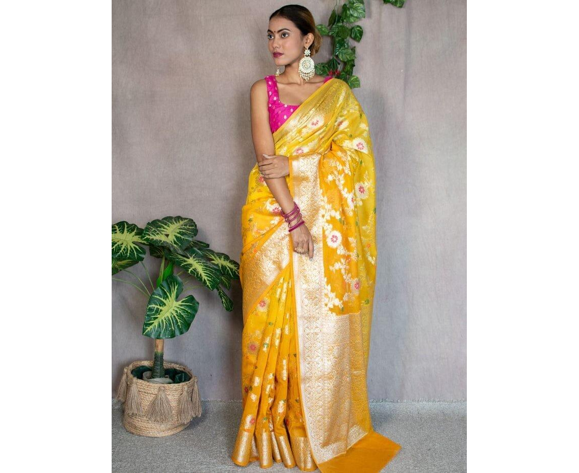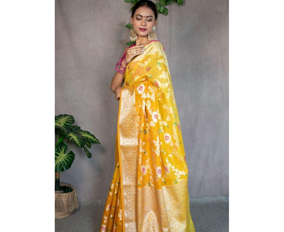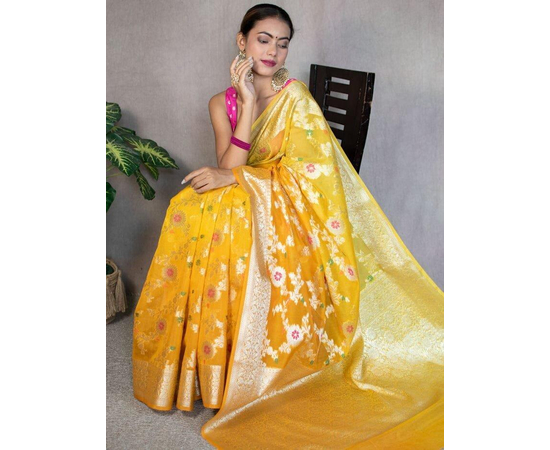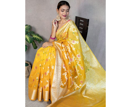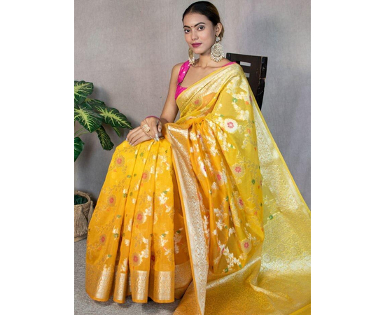 Occasion: Benarasi sarees, including those made from Sami Georgette Silk with meena jaal work, are often considered suitable for weddings, festive occasions, and other formal events due to their rich and luxurious appearance.