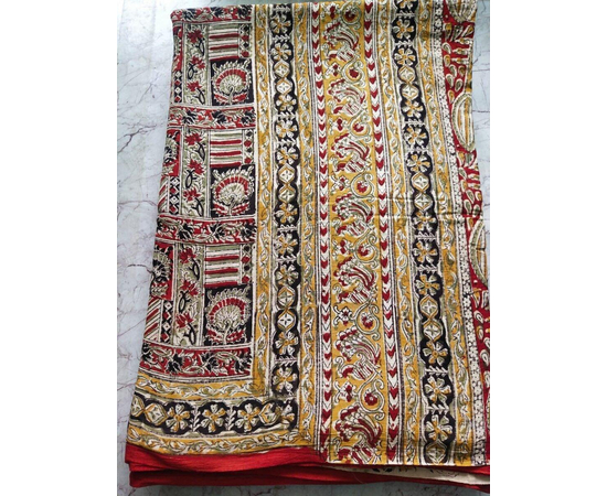 This Kalamkari Print Heavy Saree Is Crafted With 100% Pure Cotton Base Heavy Sari Pallu & Border Features Multi Color Kalamkari Work With Floral & Paisley Design.