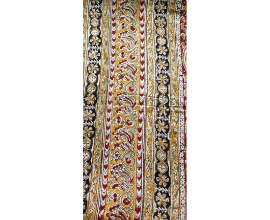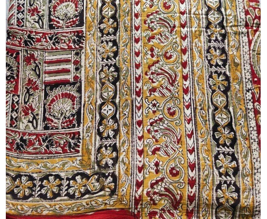 Pedana Kalamkari is a highly popular form of hand-painted or block-printed cotton textile and paintings, practiced in Andhra Pradesh, India. The beautifully printed saree with floral designs is a wonderful example of this form of art. It is a form of painting cotton fabrics with a kalam/Block i.e. pen/Block, which involves a sharp-pointed pierced bamboo regulating the flow of colour on the fabric.