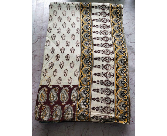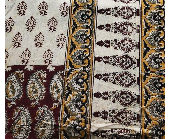 Pedana Kalamkari is a highly popular form of hand-painted or block-printed cotton textile and paintings, practiced in Andhra Pradesh, India. The beautifully printed saree with floral designs is a wonderful example of this form of art. It is a form of painting cotton fabrics with a kalam/Block i.e. pen/Block, which involves a sharp-pointed pierced bamboo regulating the flow of colour on the fabric.