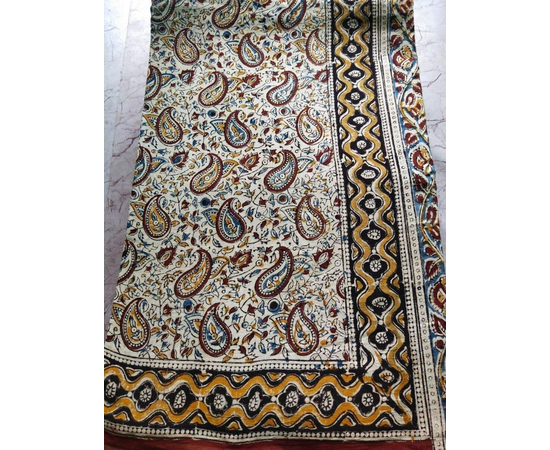 This Kalamkari Print Heavy Saree Is Crafted With 100% Pure Cotton Base Heavy Sari Pallu & Border Features Multi Color Kalamkari Work With Floral & Paisley Design.