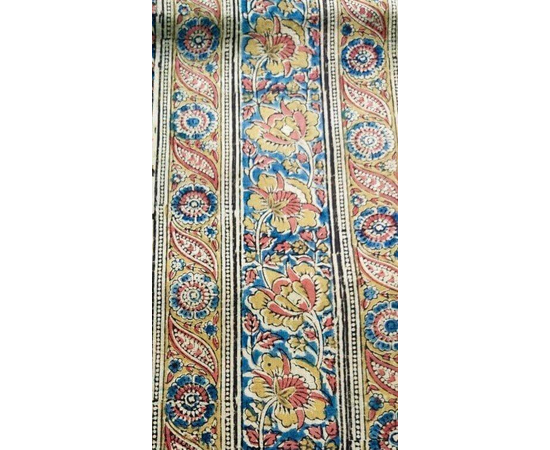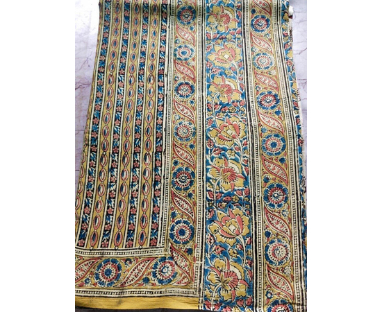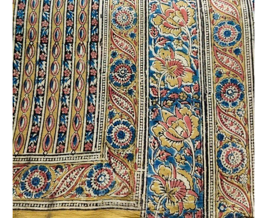 Pedana Kalamkari is a highly popular form of hand-painted or block-printed cotton textile and paintings, practiced in Andhra Pradesh, India. The beautifully printed saree with floral designs is a wonderful example of this form of art. It is a form of painting cotton fabrics with a kalam/Block i.e. pen/Block, which involves a sharp-pointed pierced bamboo regulating the flow of colour on the fabric.