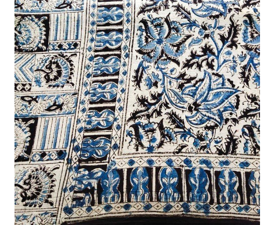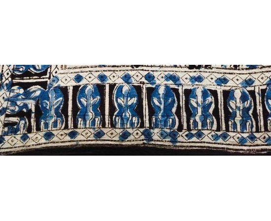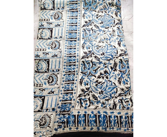 Pedana Kalamkari is a highly popular form of hand-painted or block-printed cotton textile and paintings, practiced in Andhra Pradesh, India. The beautifully painted saree with floral and leaves design is a wonderful example of this form of art. It is a form of painting cotton fabrics with a kalam/Block i.e. pen/Block, which involves a sharp-pointed pierced bamboo regulating the flow of colour on the fabric.