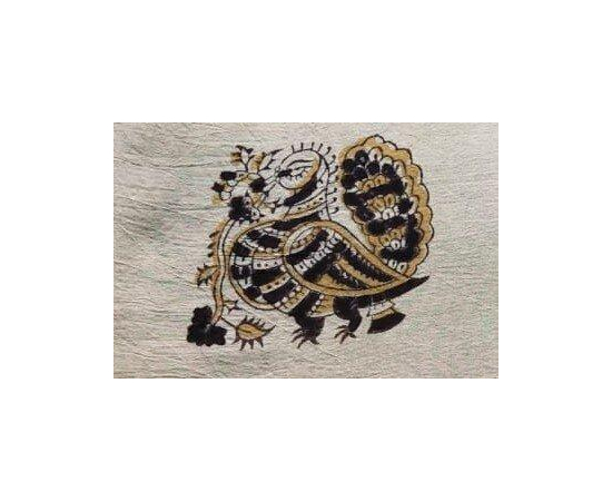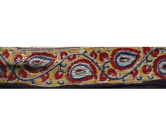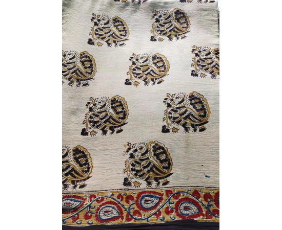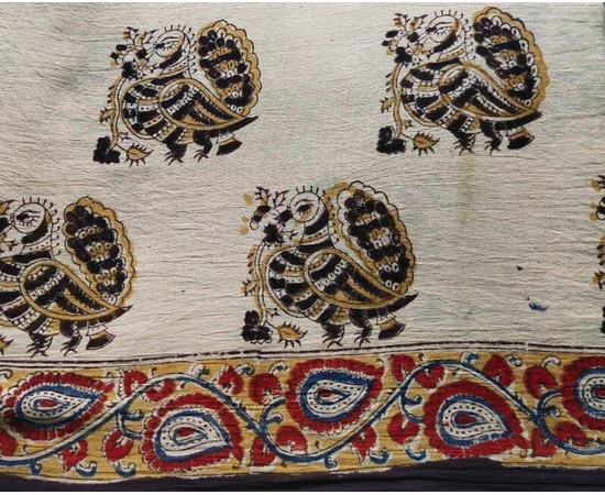 Pedana Kalamkari is a highly popular form of hand-painted or block-printed cotton textile and paintings, practiced in Andhra Pradesh, India. The beautifully painted saree with floral and peacock designs is a wonderful example of this form of art. It is a form of painting cotton fabrics with a kalam/Block i.e. pen/Block, which involves a sharp-pointed pierced bamboo regulating the flow of colour on the fabric.