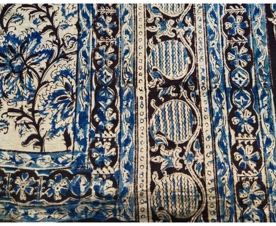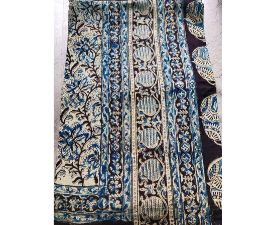 Pedana Kalamkari is a highly popular form of hand-painted or block-printed cotton textile and paintings, practiced in Andhra Pradesh, India. The beautifully printed saree with floral designs is a wonderful example of this form of art. It is a form of painting cotton fabrics with a kalam/Block i.e. pen/Block, which involves a sharp-pointed pierced bamboo regulating the flow of colour on the fabric.