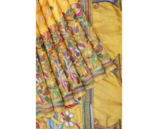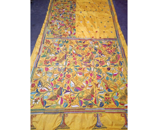 Kantha the embroidery done on saree / dupatta or cloth is a craft characterized by the 'running stitch' is done by hand. The word originated from Sanskrit ‘kontha’ means 'rags.' It’s believed that Lord Buddha and his disciples used to cover themselves with discarded rags garments that were patched and sewn together. Rags in India is displayed at shrines and even tied to trees symbolise prayers and wards off the evil eye. Kantha date from the early 1800s and was done mainly in East Bengal present day West Bengal and Bihar.
