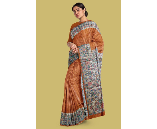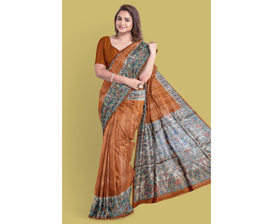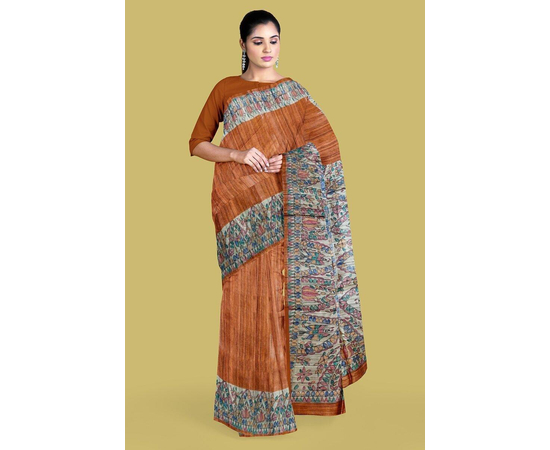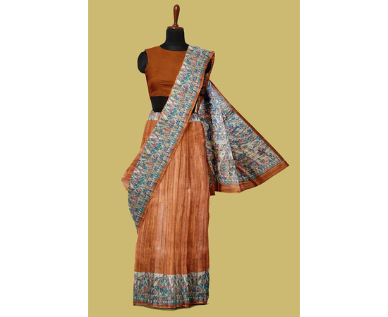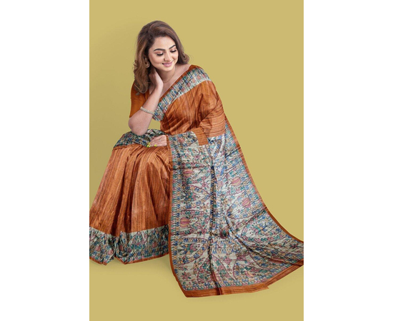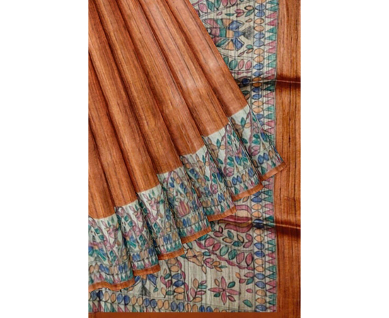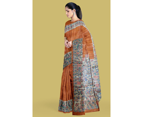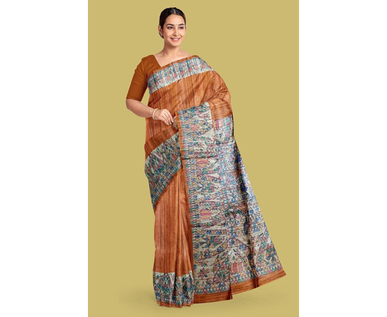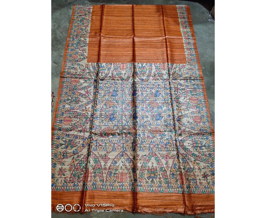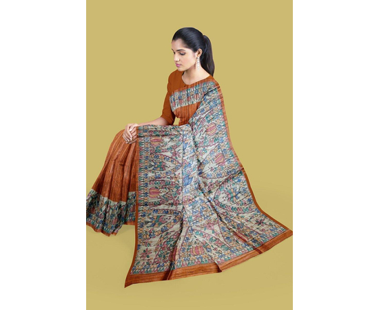 Madhubani Hand painted Tussar Ghicha Saree with Silk Mark. Sourced from the artisans of Madhubani, Bihar
