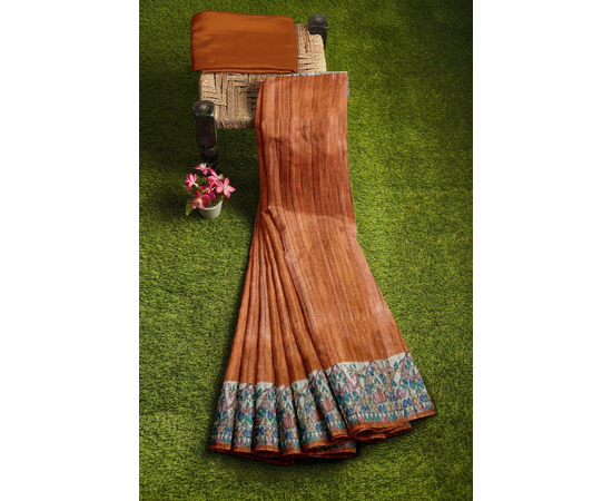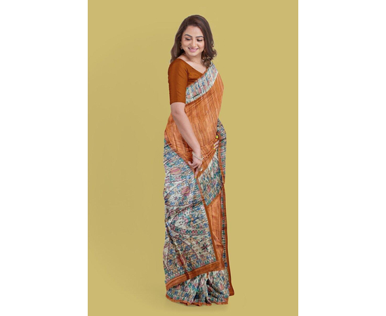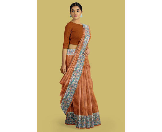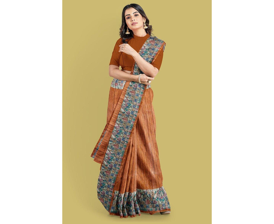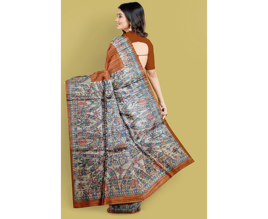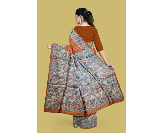 Madhubani arts began in the Mithila. The Mithila art on Madhubani painted sarees is an excellent work done by professionals to depict the old part of the culture. Soft, Rich Madhubani art work all over the saree, contained superior Tassar or tussar Silk body with blouse piece. The unique designs are made by master Craftsman, with Mithila pattern all over the saree and this Madhubani saree comes with blouse piece.