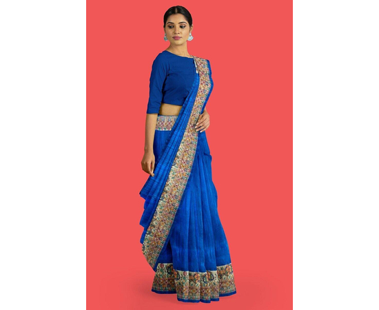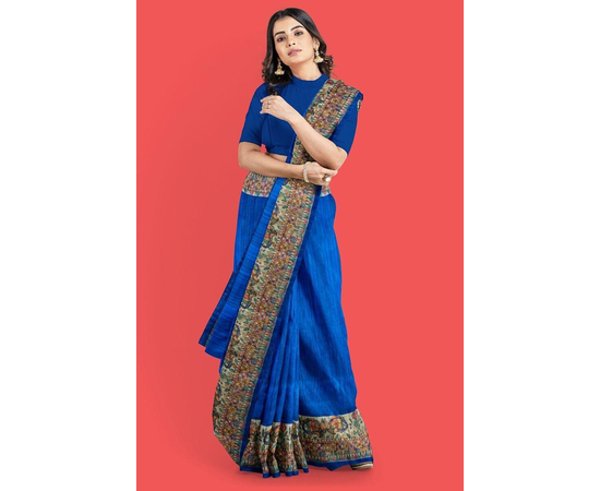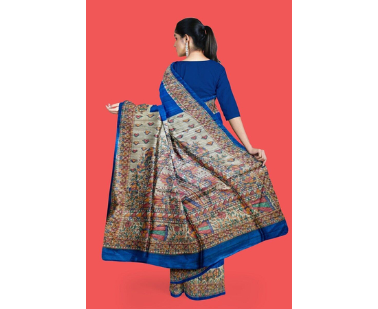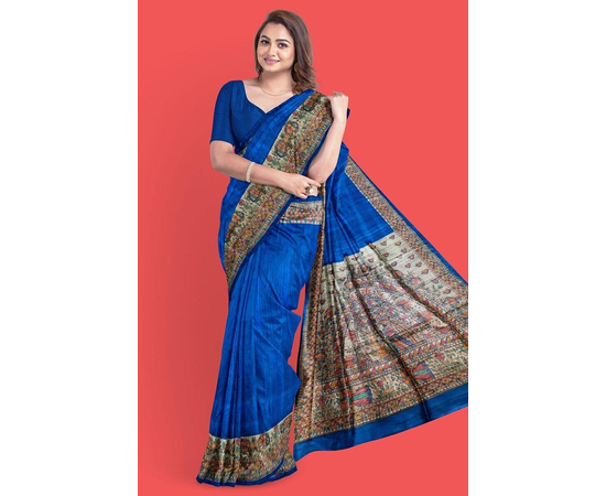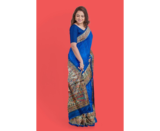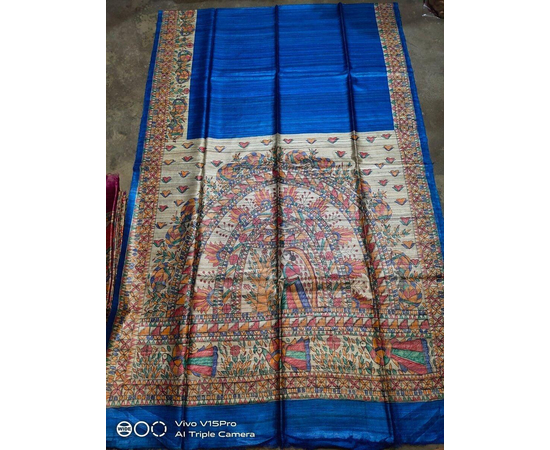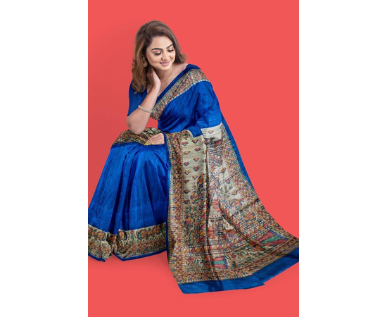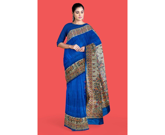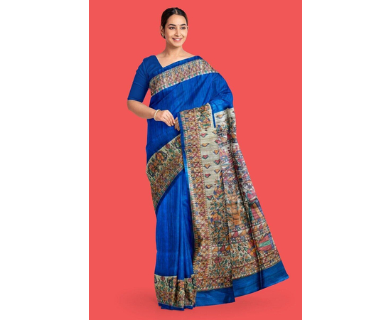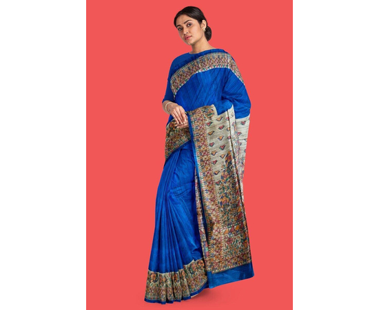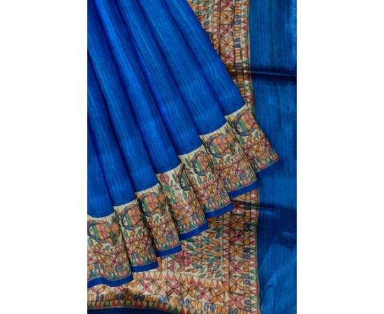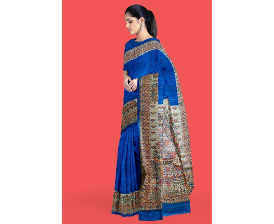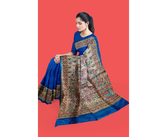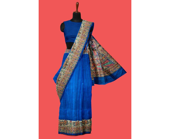 Madhubani hand Painting Saree on Natural Tussar Silk | Handpainted saree | Silk mark certified saree | Sari Madhubani Hand Painted - Tussar Ghicha | Blue Saree