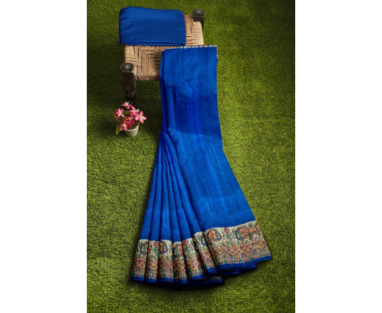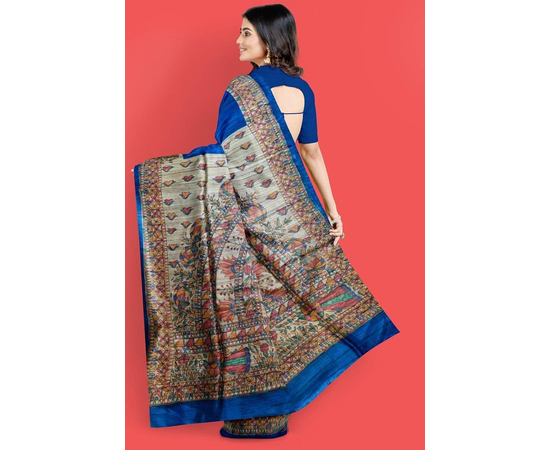 Madhubani arts began in the Mithila. The Mithila art on Madhubani painted sarees is an excellent work done by professionals to depict the old part of the culture. Soft, Rich Madhubani art work all over the saree, contained superior Tassar or tussar Silk body with blouse piece. The unique designs are made by master Craftsman, with Mithila pattern all over the saree and this Madhubani saree comes with blouse piece.