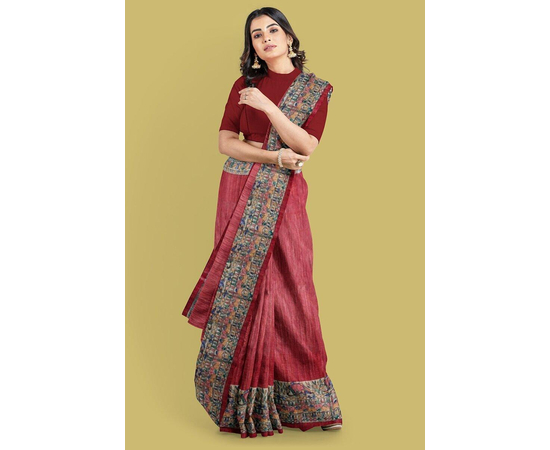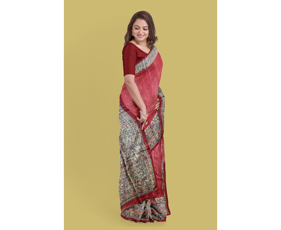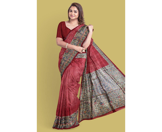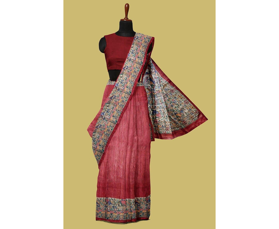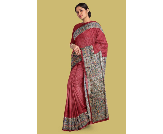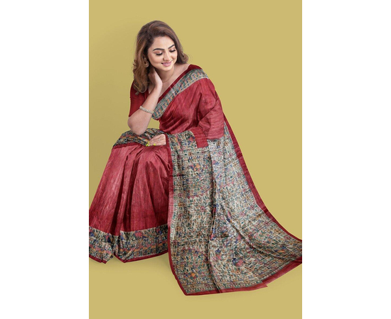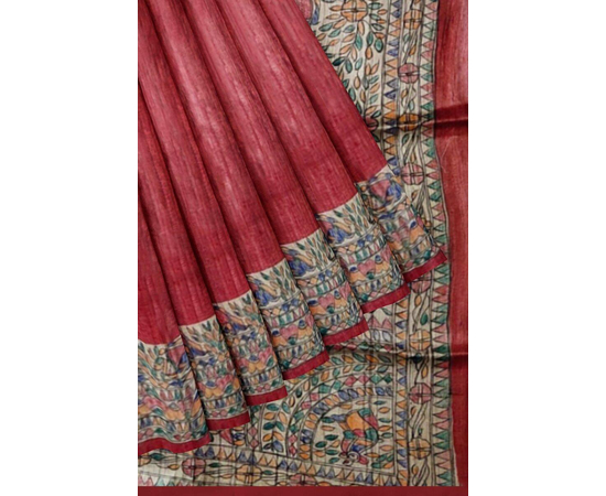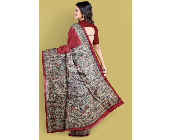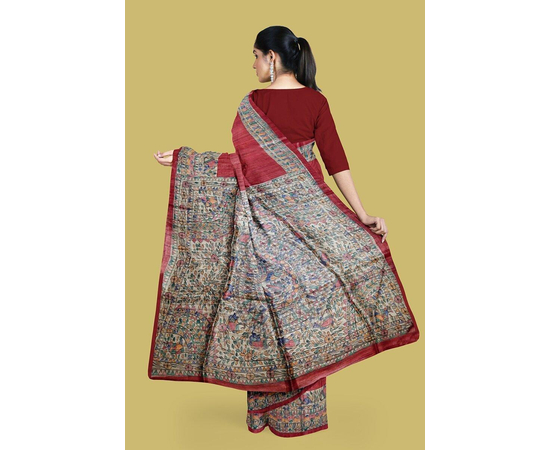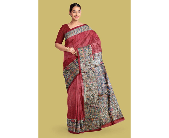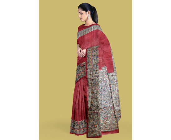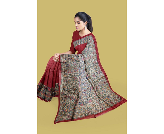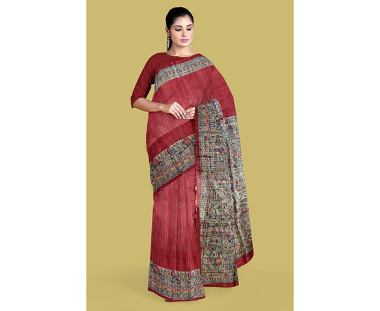 Madhubani hand painting Maroon Saree on Natural Tussar Silk | Handpainted saree | Silk mark certified saree | Sari Madhubani Hand Painted - Tussar Ghicha