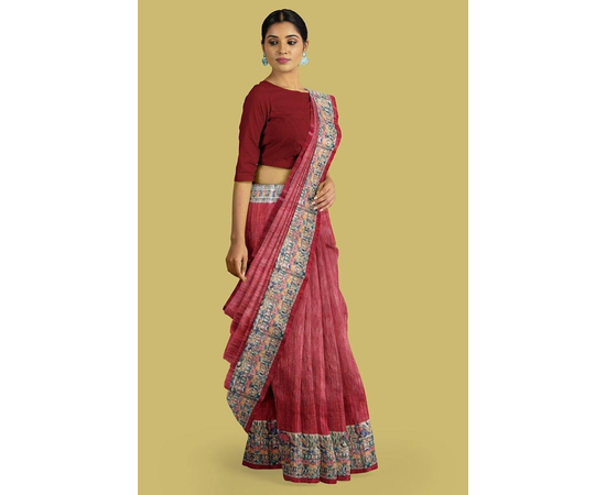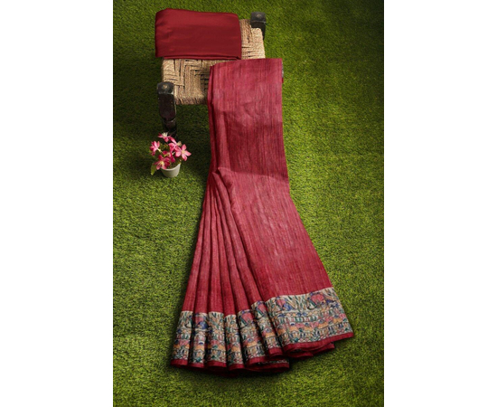 Madhubani arts began in the Mithila. The Mithila art on Madhubani painted sarees is an excellent work done by professionals to depict the old part of the culture. Soft, Rich Madhubani art work all over the saree, contained superior Tassar or tussar Silk body with blouse piece. The unique designs are made by master Craftsman, with Mithila pattern all over the saree and this Madhubani saree comes with blouse piece.