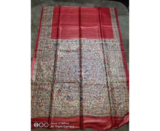 Madhubani Hand painted Tussar Ghicha Saree with Silk Mark. Sourced from the artisans of Madhubani, Bihar