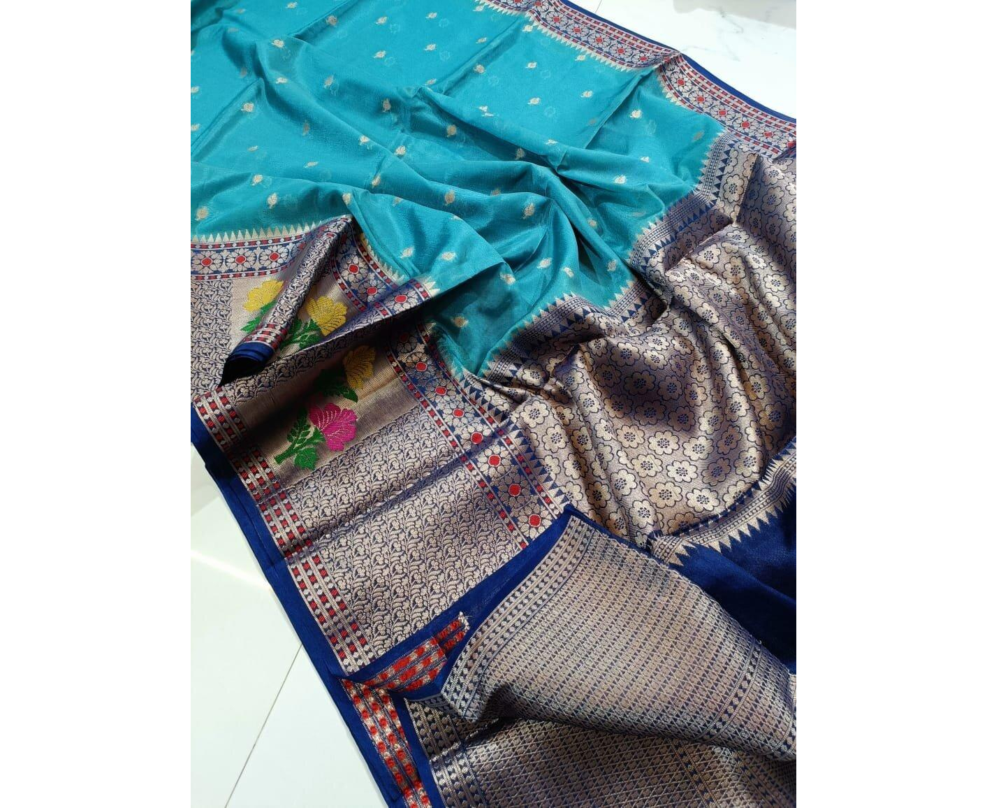 Double Zari Embellishments: Adorned with intricate double zari work, these sarees showcase the richness of Banarasi craftsmanship, creating a stunning interplay of light and texture.