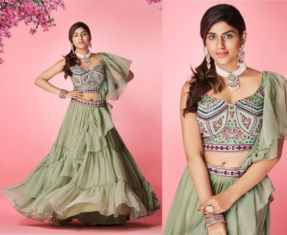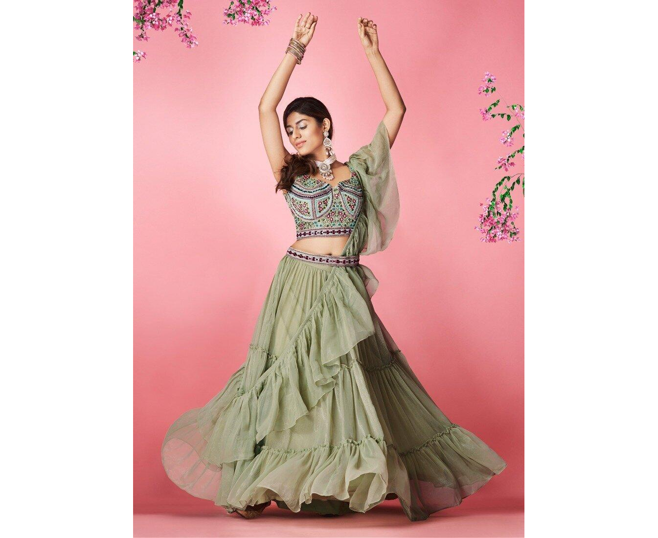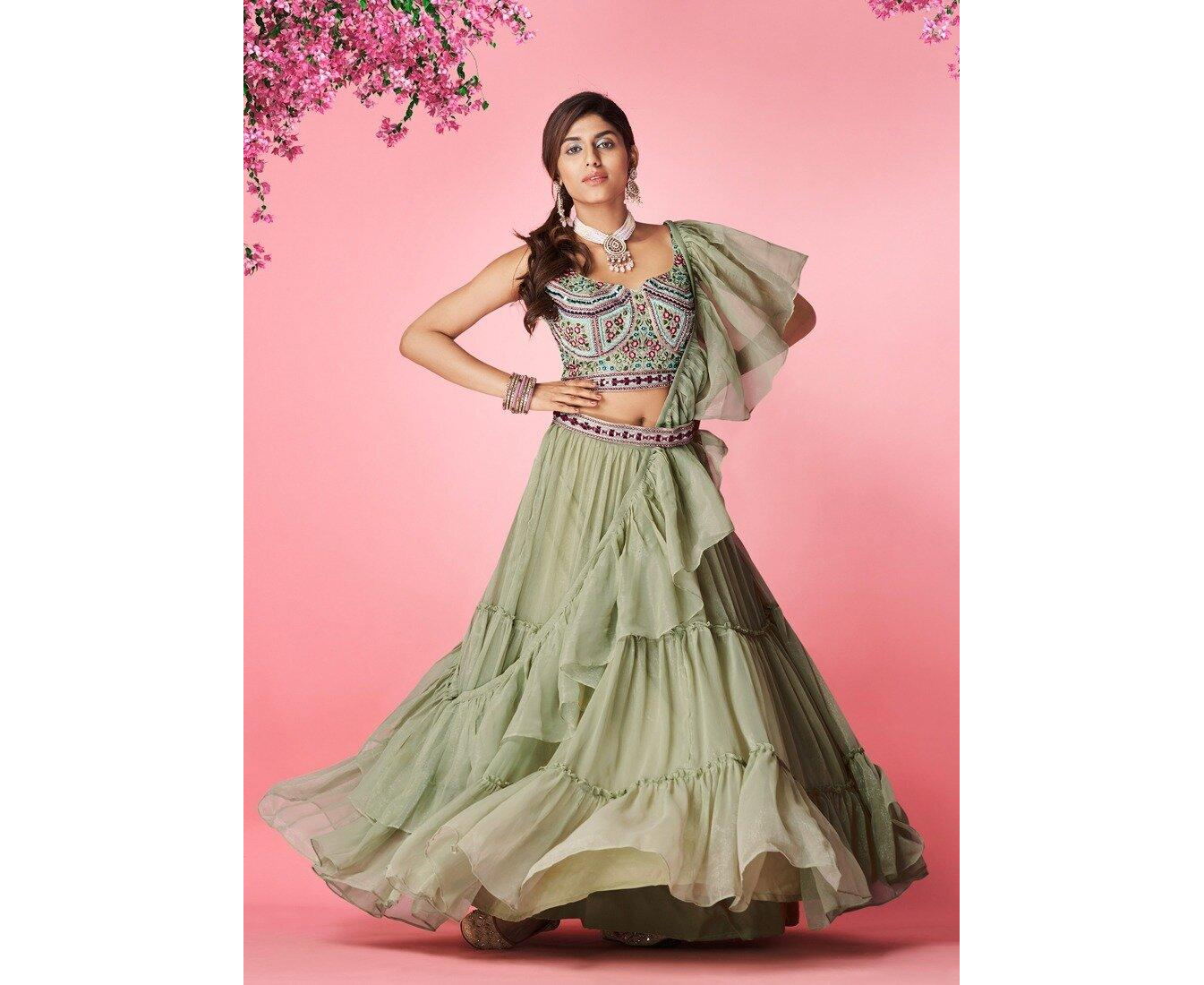 The combination of chiffon fabric and the aqua color makes this lehenga set a perfect choice for festive occasions.
