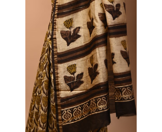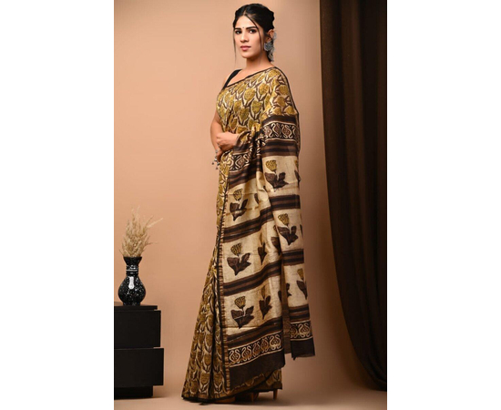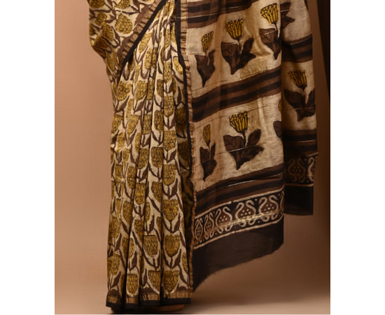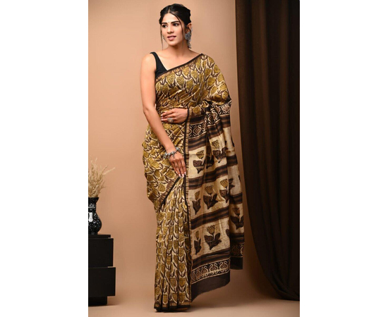 Traditional Pure Ajrakh and bagru print Hand block Printed Chanderi silk Saree With attached Unstitched Blouse, Indian Party wear sari in Mustard & Cream Shade