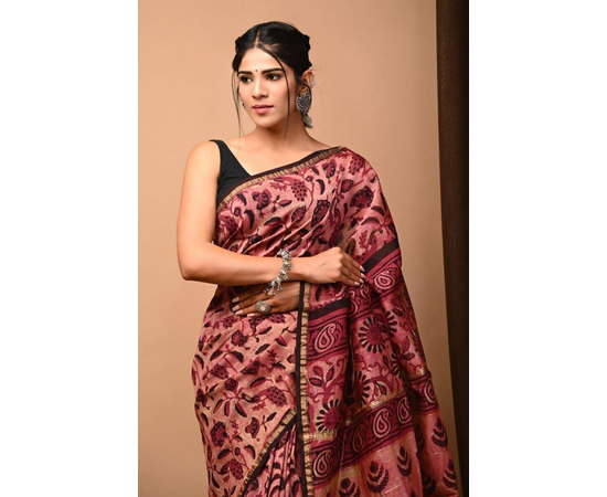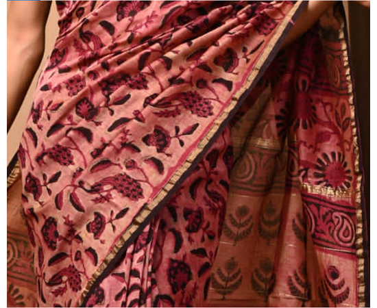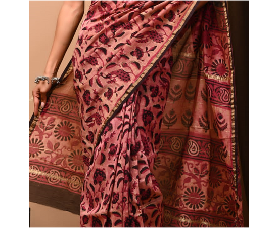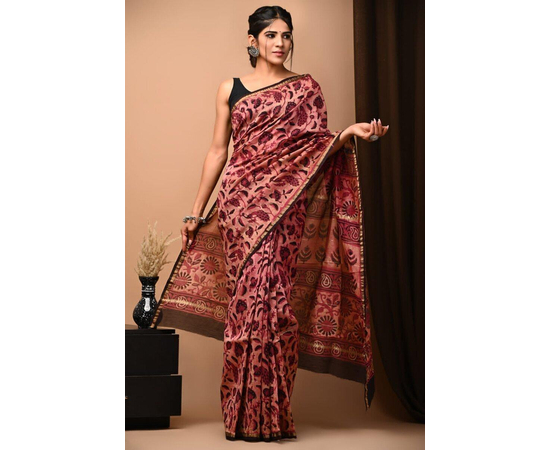 Traditional Pure Ajrakh and bagru print Hand block Printed Chanderi silk Saree With attached Unstitched Saree Blouse, Indian ethnic wear sari for women