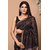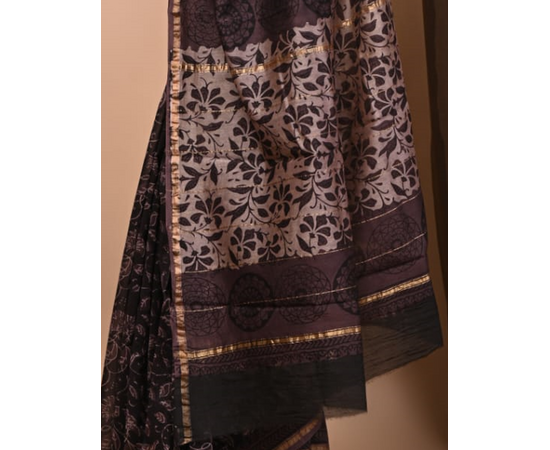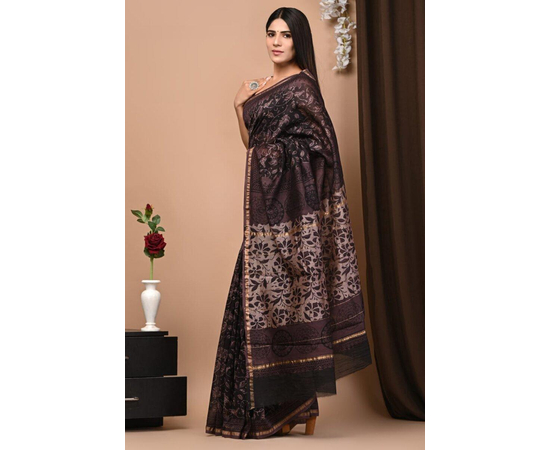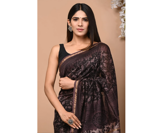 Traditional Pure Ajrakh and bagru print Hand block Printed Chanderi silk Saree With attached Unstitched Blouse, Indian wear Garden Print sari in dark brown shade