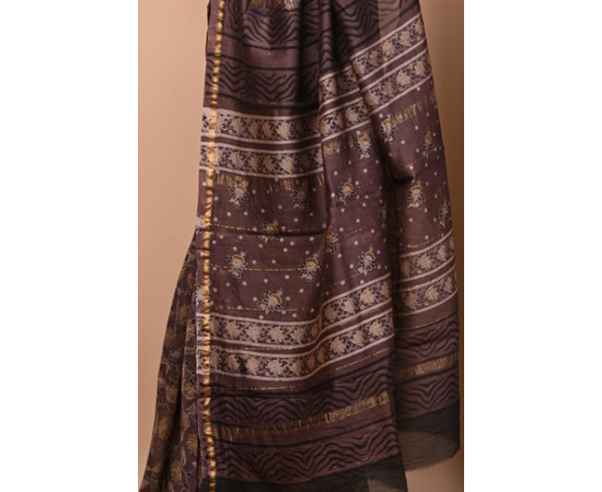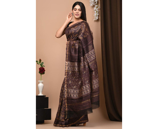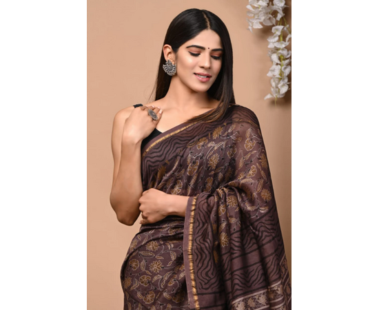 Traditional Pure Ajrakh and bagru print Hand block Printed Chanderi silk Brown Color Saree With attached Unstitched Blouse, Indian Traditional wear sari for women