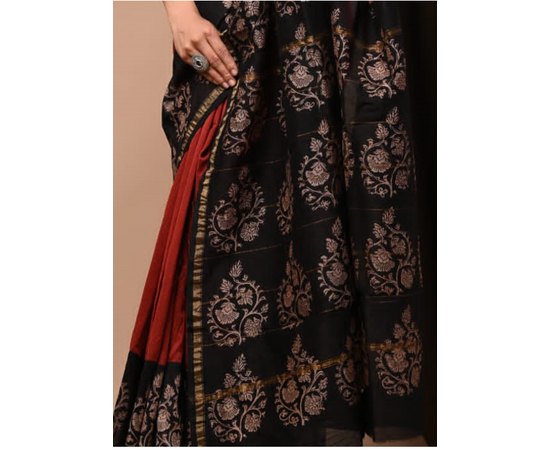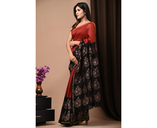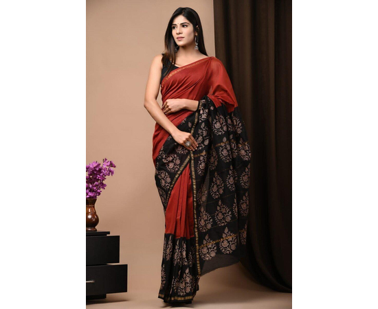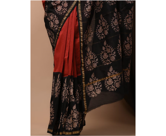 Traditional Pure Ajrakh and bagru print Hand block Printed Chanderi silk Saree With attached Unstitched Saree Blouse, ethnic wear red sari for women