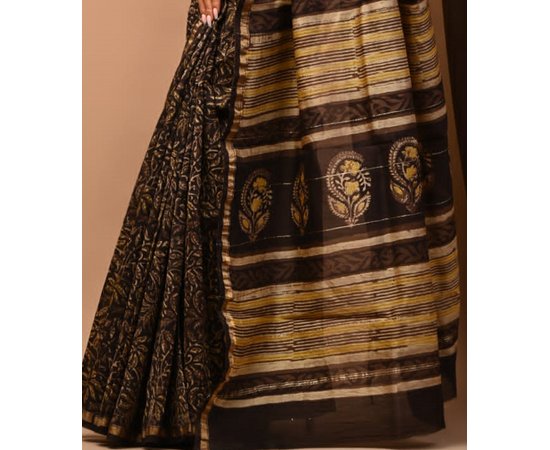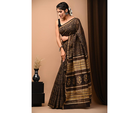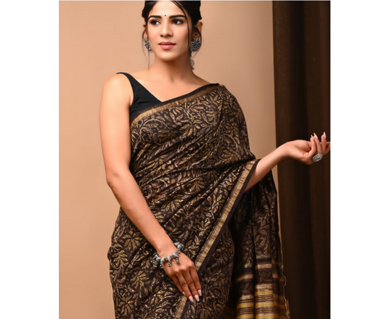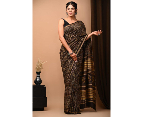 Traditional Pure Ajrakh and bagru print Hand block Printed Chanderi silk Saree With attached Unstitched Saree Blouse, Indian wear Black sari for women