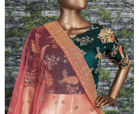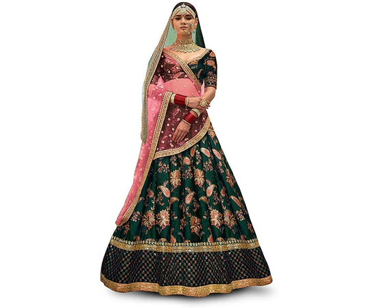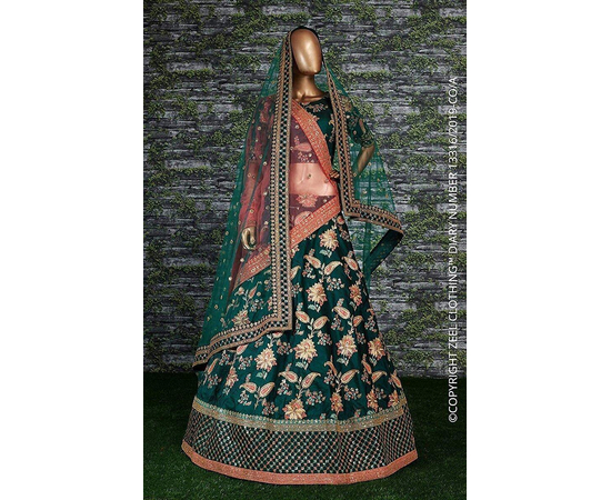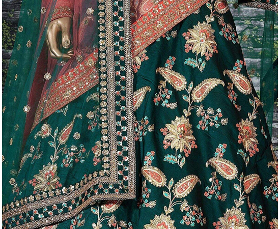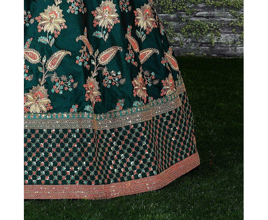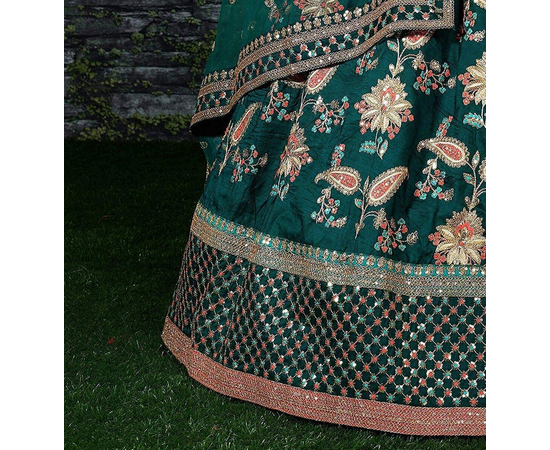 - Be a symbol of bespoke Indian beauty with this truly traditional lehenga. Color, Material & Work: This ethnic lehenga is prepared on a rich green-colored taffeta silk fabric. It is bedazzled with heavy zari, Dori, Sequins, and multi-color Thread Embroidery work. The semi-stitched skirt has elaborately embroidered borders in the lower part with intricate detailing, post these set of borders, floral border motifs out till the upper end. The unstitched blouse is of the same fabric and has the same meticulously done zari, Dori, Sequins, and multi-color Thread Embroidery work throughout. It comes with maroon and peach (two-dupattas) net dupatta are paneled with a heavily Dori worked border and are completed with sequins booties across its entire length. Adorn a timeless charm with this luxuriant ensemble, reeking of royalty.