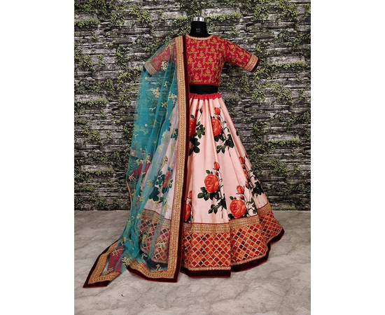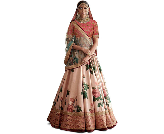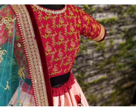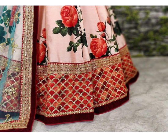 - Lehenga Work: Digital print and Embroidered with Dori and Sequins, Blouse Work: Dori, Sequins & Heavily Embroidered with Threads and Jari, Dupatta Work: Dori and Sequins Embroidered