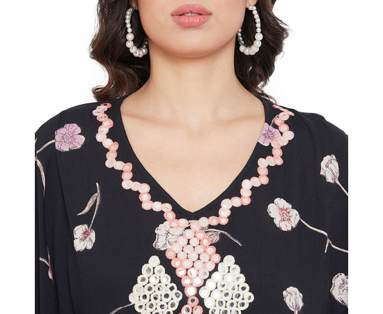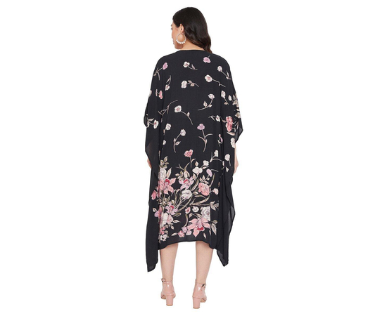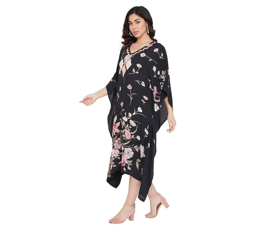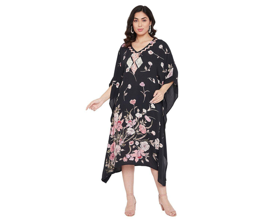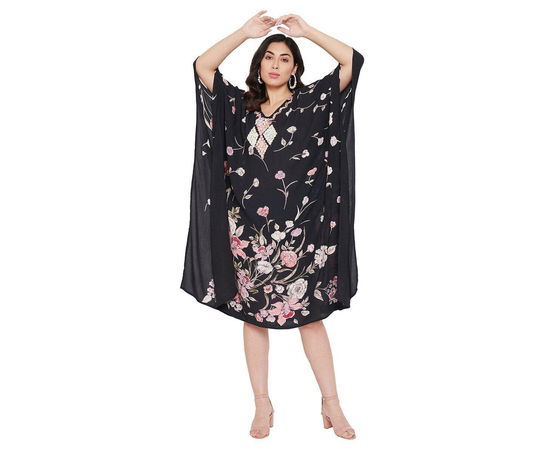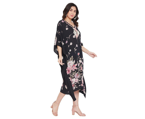 Ladies Rayon Crepe Long Kaftan, Party Wear Dress, Indian Tunic, Caftan Midi Dress, short kimono top dress, Black and Pink Kaftan Dress