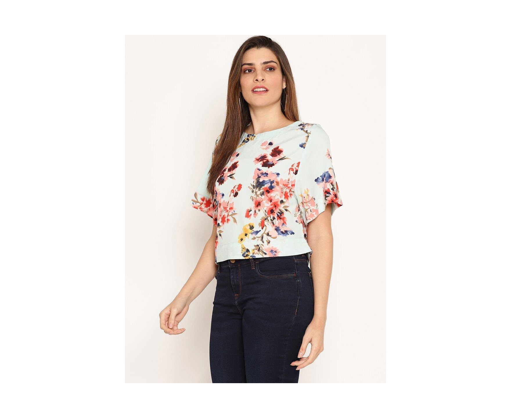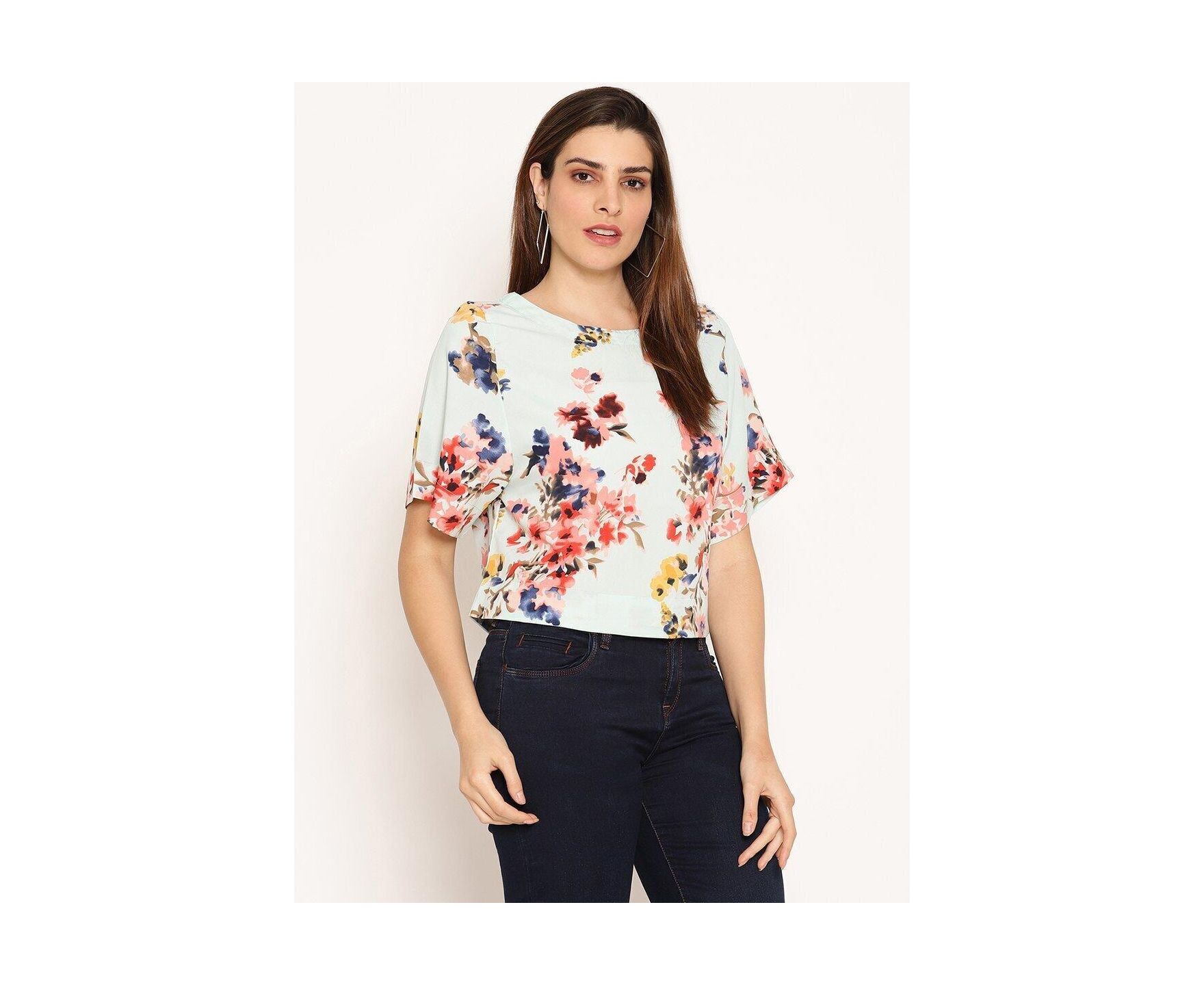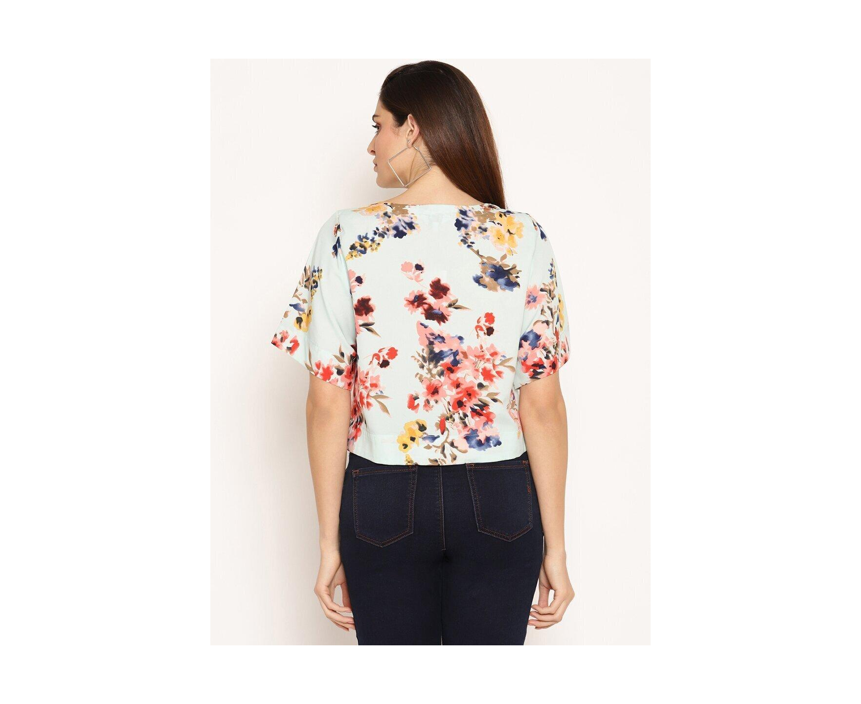 Women's Poly Crepe Turquoise white Floral Top, Natured Top, Floral simple Top, Handmade floral crop top