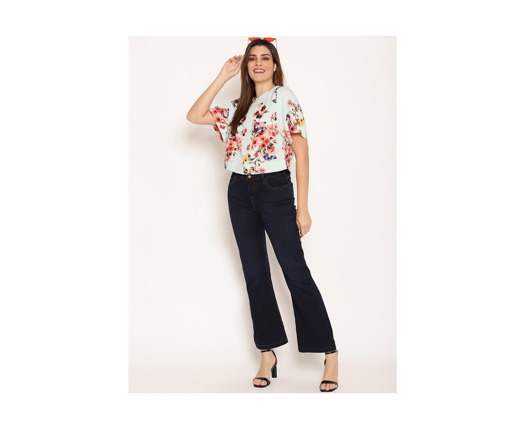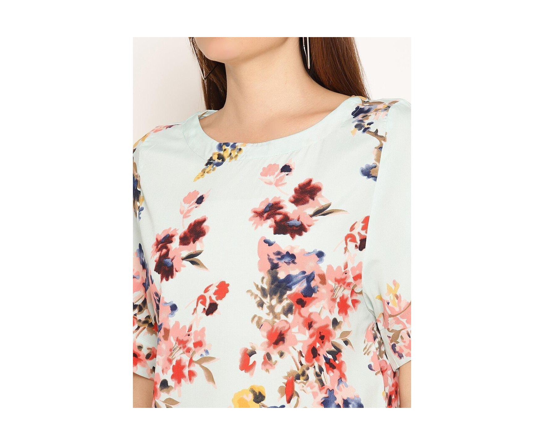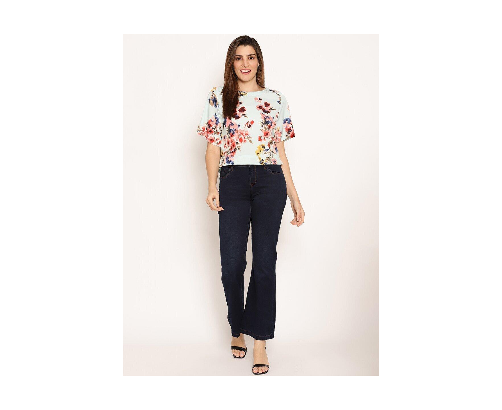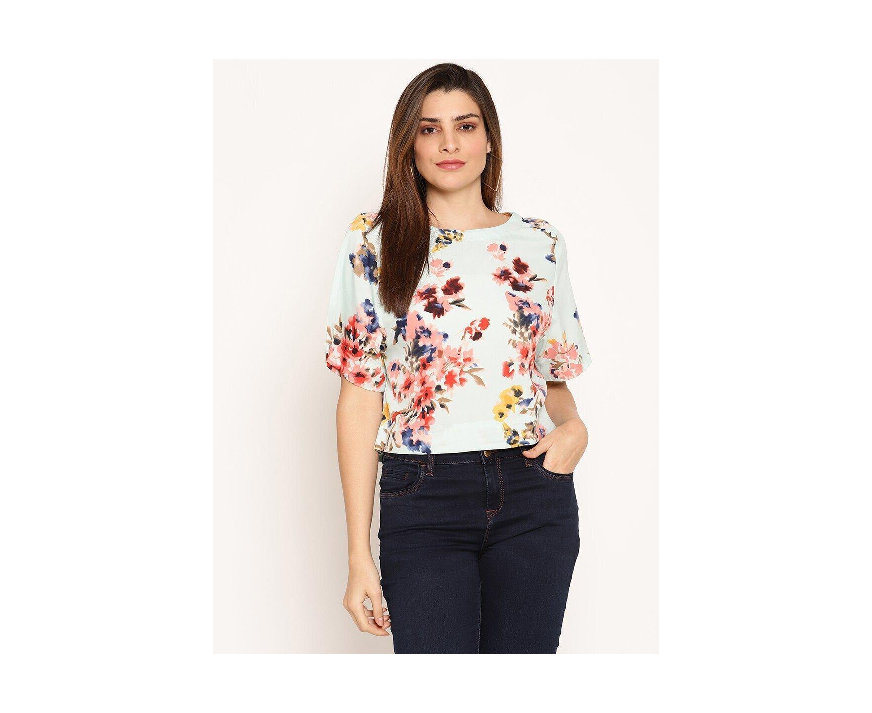 Women's Poly Crepe Turquoise white Floral Top, Natured Top, Floral simple Top, Handmade floral crop top