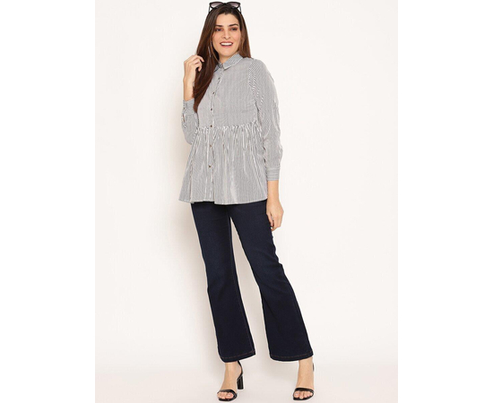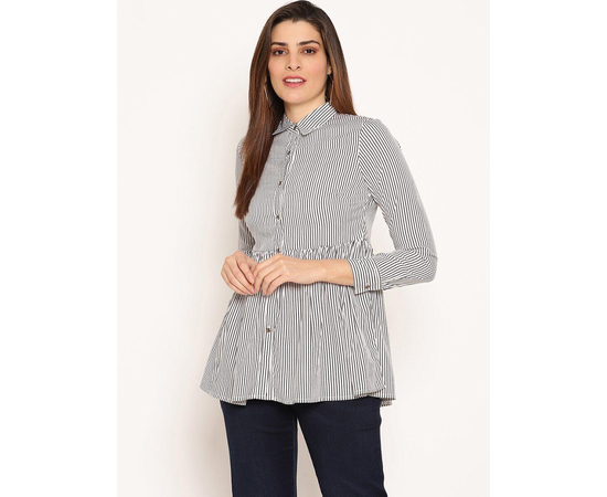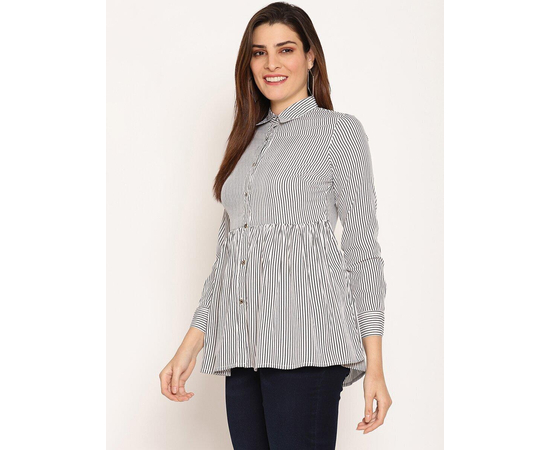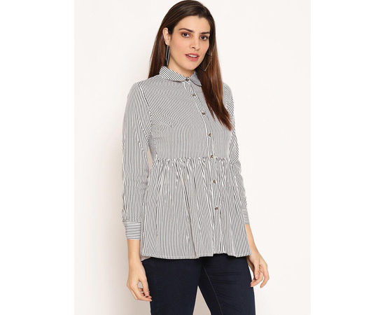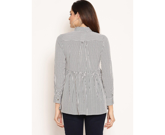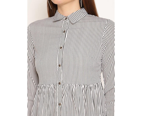 Full Sleeve Summer Shirt Top | Women's Poly Crepe Striped White and Black Shirt | Frock style Shirt